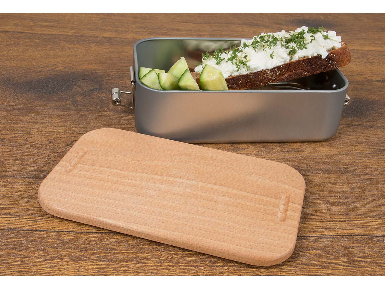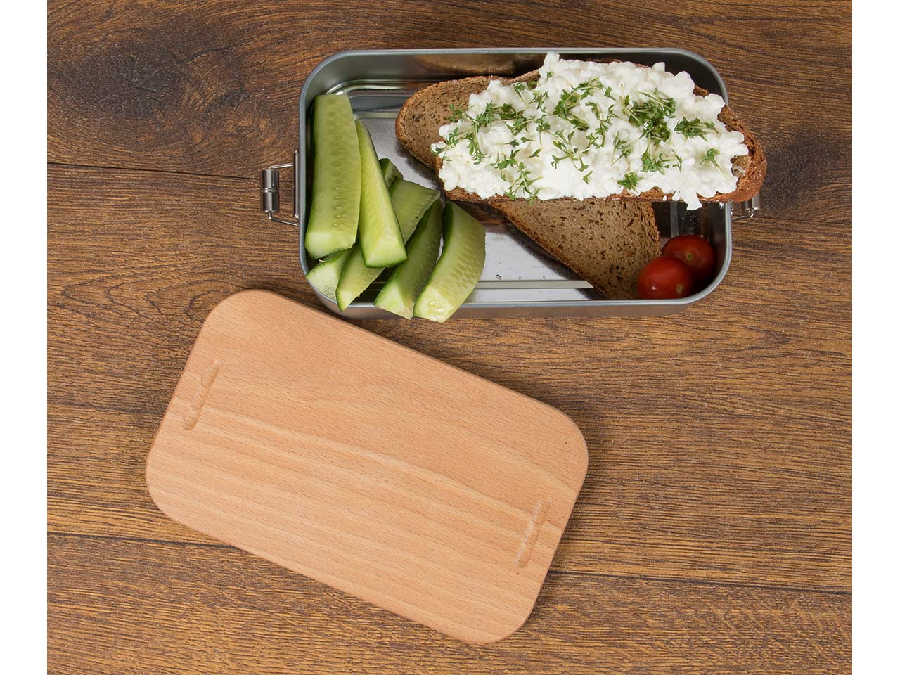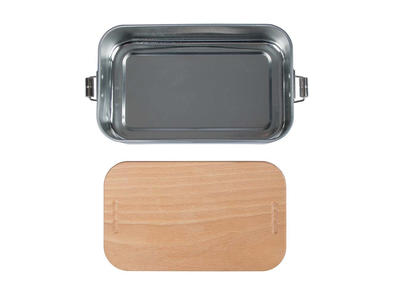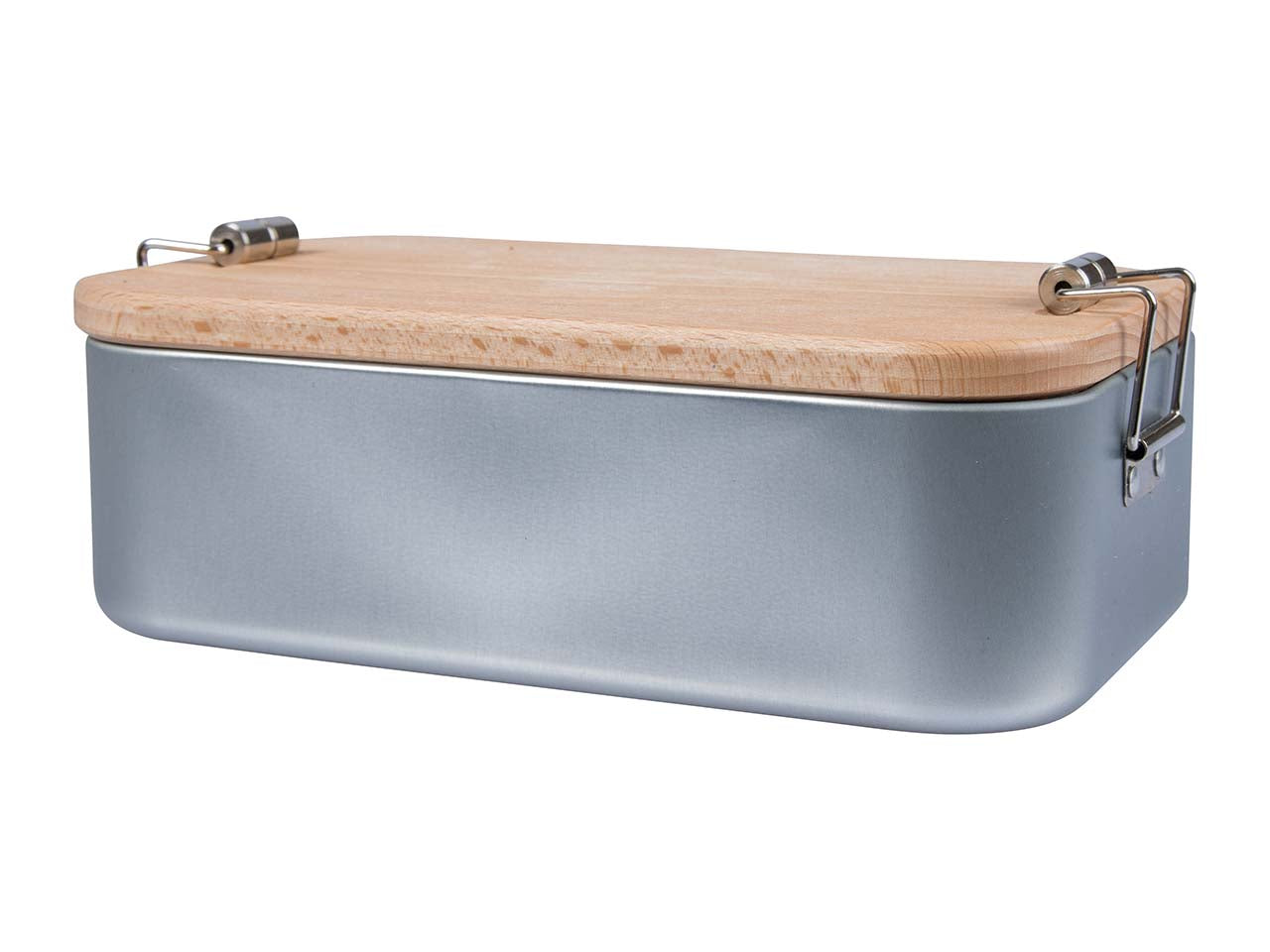 In deze innovatieve lunchbox bewaar je niet alleen je favoriete snacks en tussendoortjes voor in de pauze, nee, er zit ook een bord bij! De lunchbox van zacht blik heeft een afneembaar deksel van FSC-gecertificeerd beukenhout dat als snackbord gebruikt kan worden. Dit bespaart ruimte tijdens het transport en is ongelooflijk praktisch. Om ervoor te zorgen dat de inhoud altijd optimaal beschermd is, zetten twee clipsluitingen aan de smalle zijkanten het deksel vast. Brood, groente en fruit blijven lang vers en smaken de hele dag door heerlijk. De 2-in-1 lunchbox is perfect voor school, sport, kampeeruitstapjes of werk. De plasticvrije box is niet alleen onderweg te gebruiken: hij bewaart het eten ook in de koelkast of op de keukenplank! Het hout is behandeld met zonnebloemolie, waardoor het beschermd is tegen vuil en vocht.