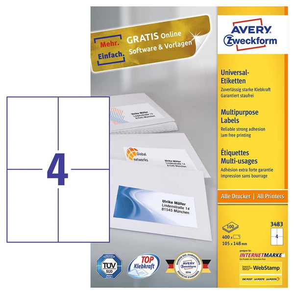 etiketten Avery/Zweckform - chloorvrij gebleekt papier - etiketten 100x A4 (4/blad = 400/pak) - 105x148 mm