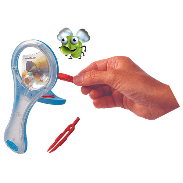 - megalens 19x9x3cm, lens 60mm (vergroot 3x) + geïntegreerde powerloep van 13mm (vergroot 7x), met staander en pincet , diverse kleuren in display