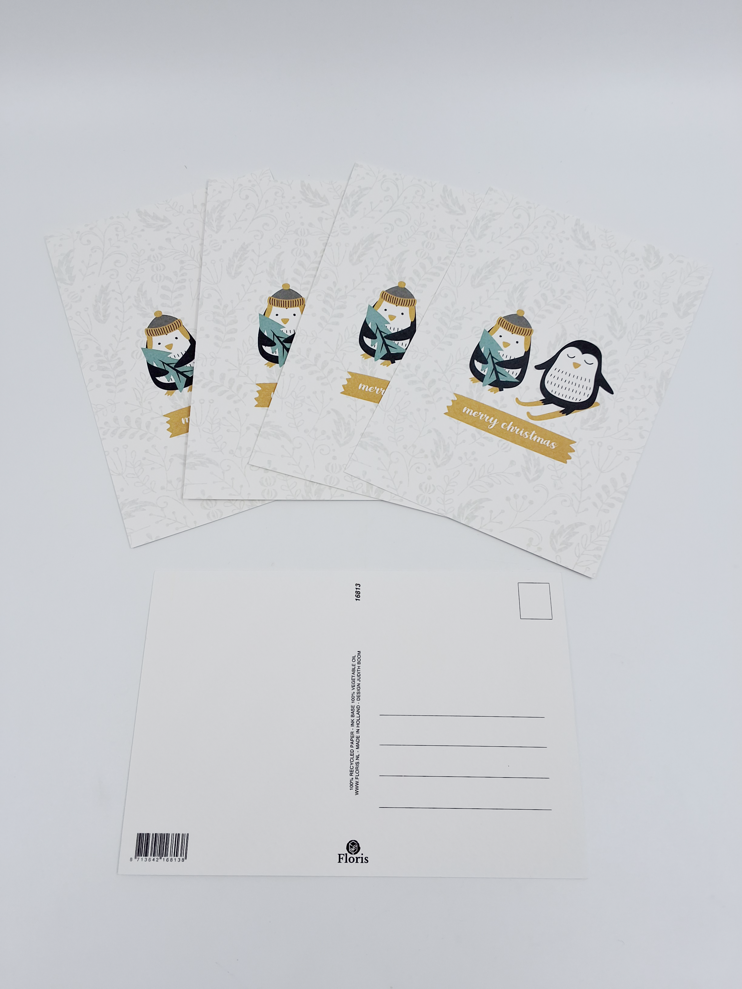 Onze kerstkaarten zijn gemaakt van gerecycled papier en bedrukt met inkt op basis van plantaardige olie.
