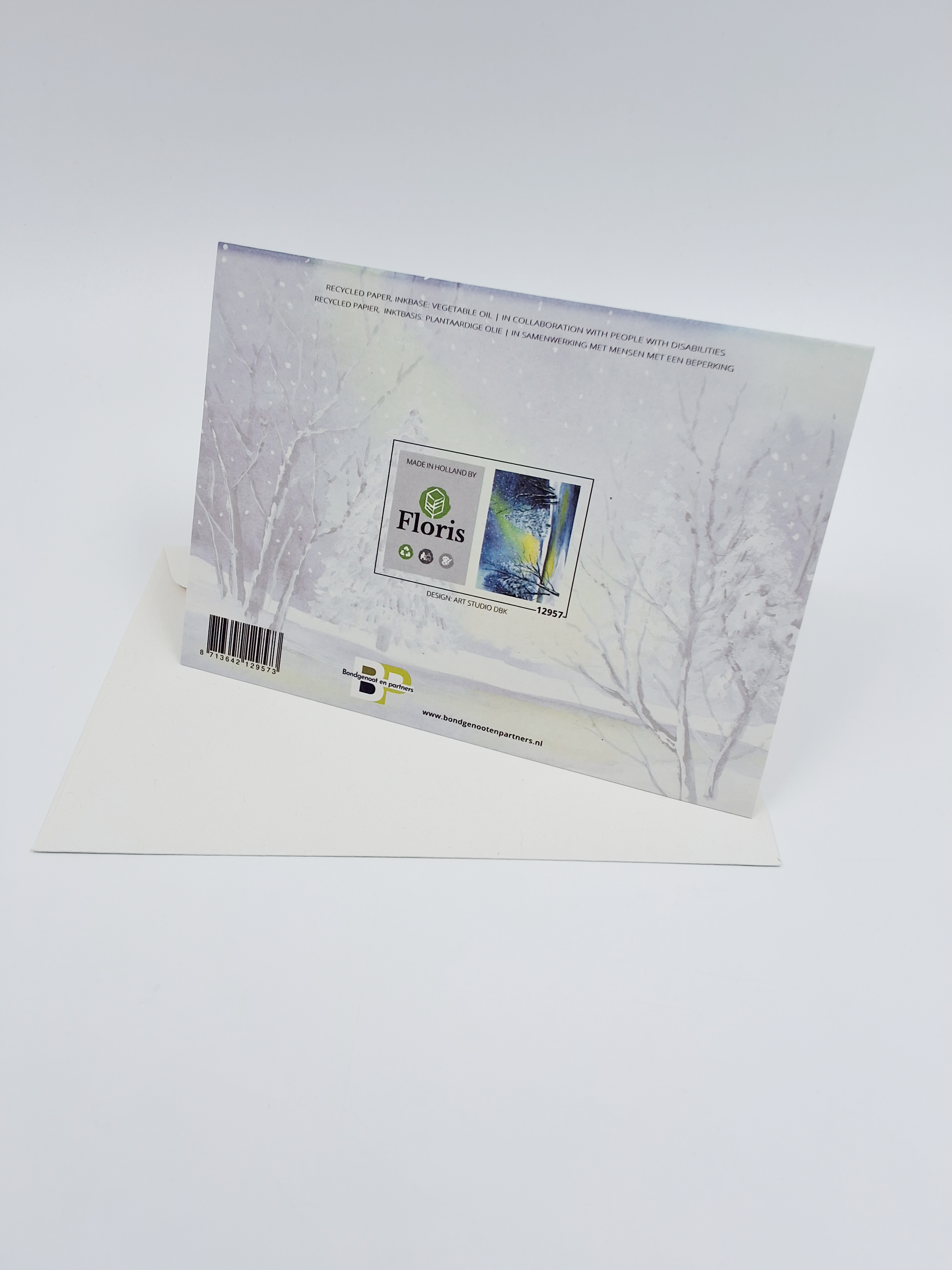 Onze kerstkaarten zijn gemaakt van gerecycled papier en bedrukt met inkt op basis van plantaardige olie.