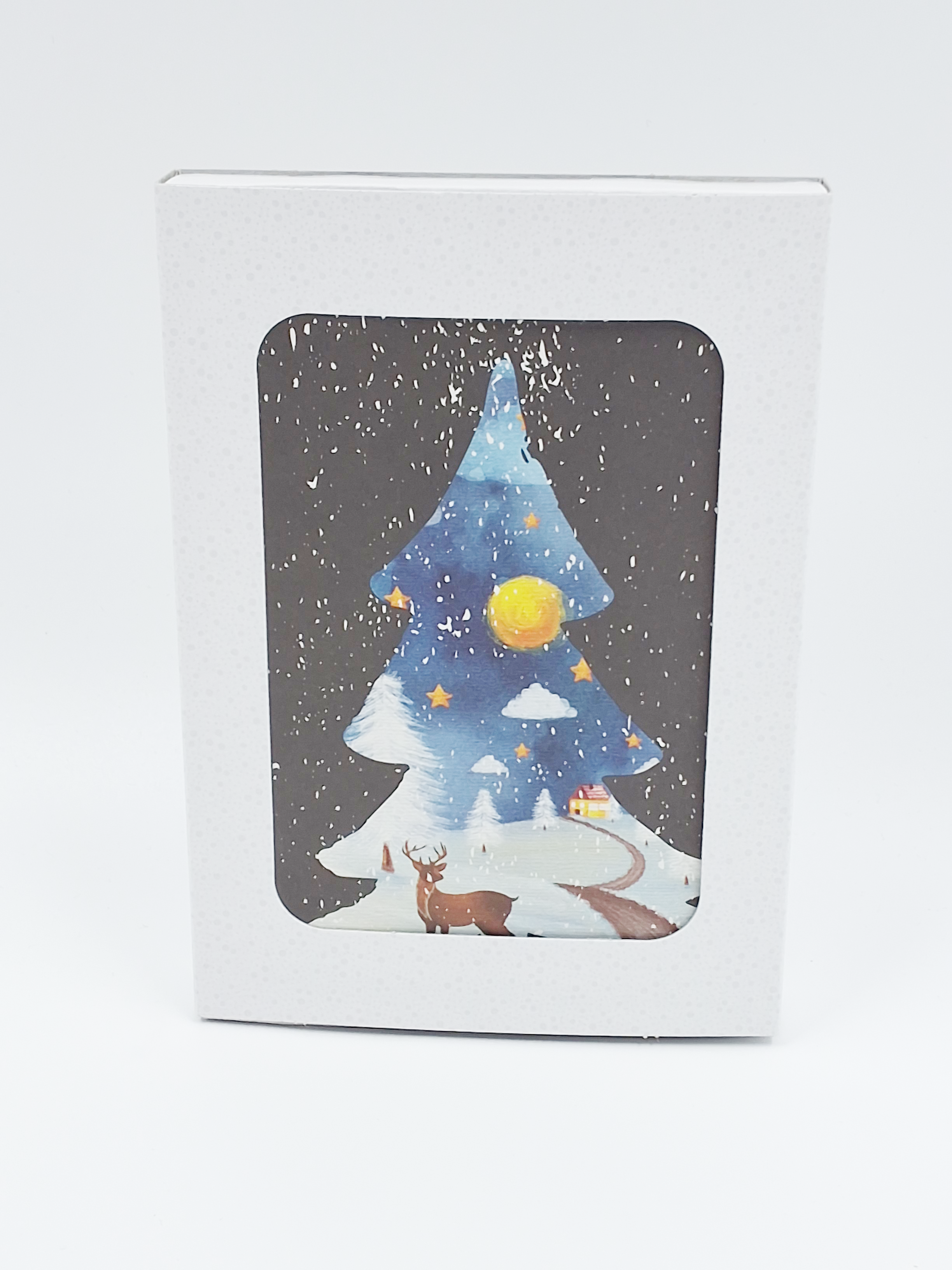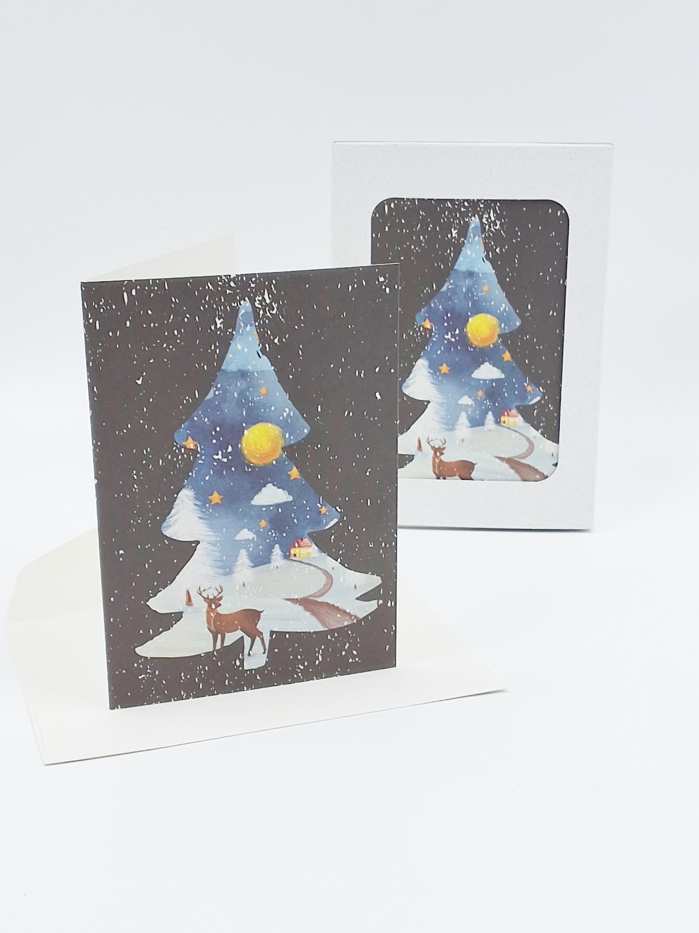 Onze kerstkaarten zijn gemaakt van gerecycled papier en bedrukt met inkt op basis van plantaardige olie.