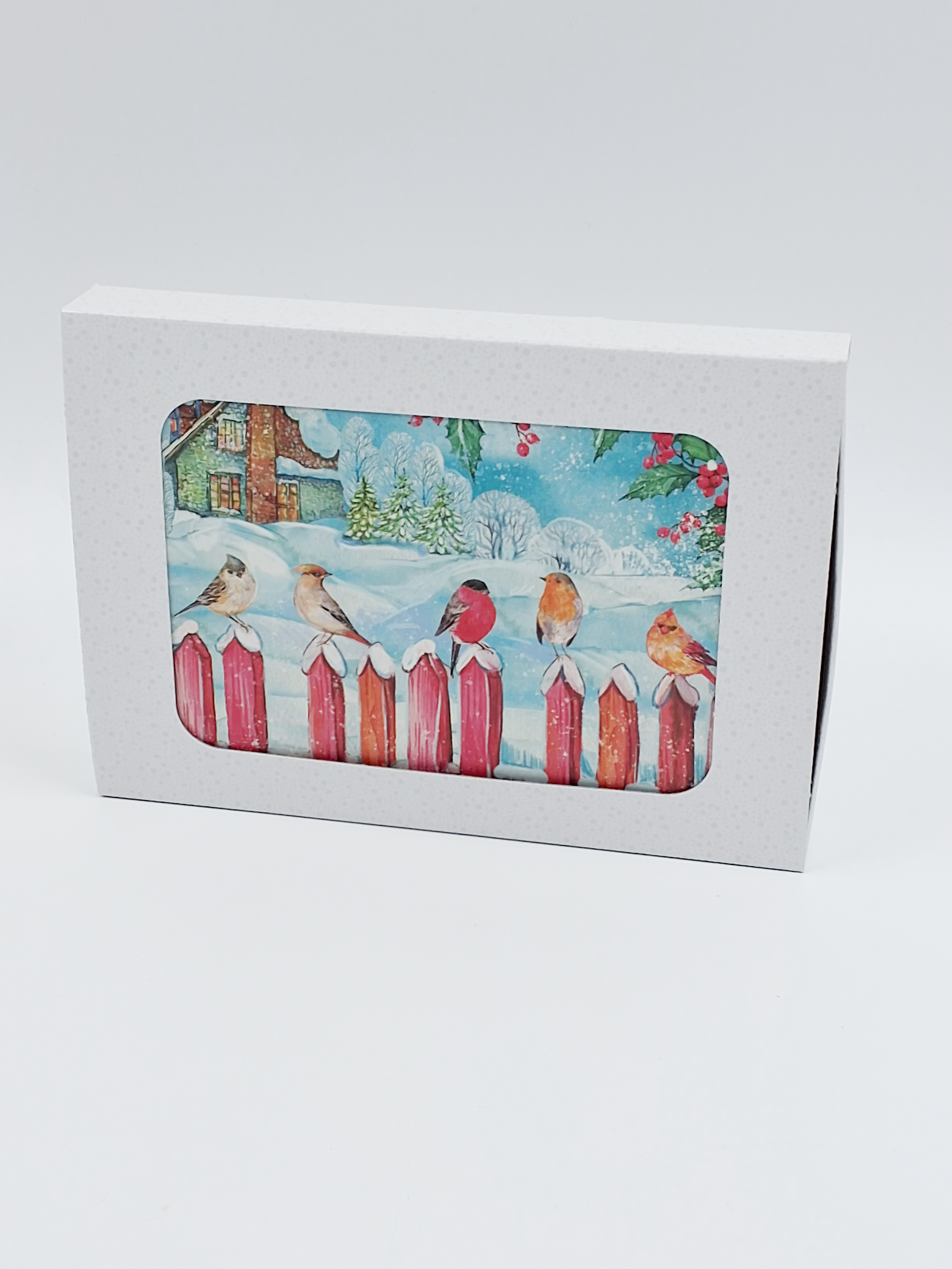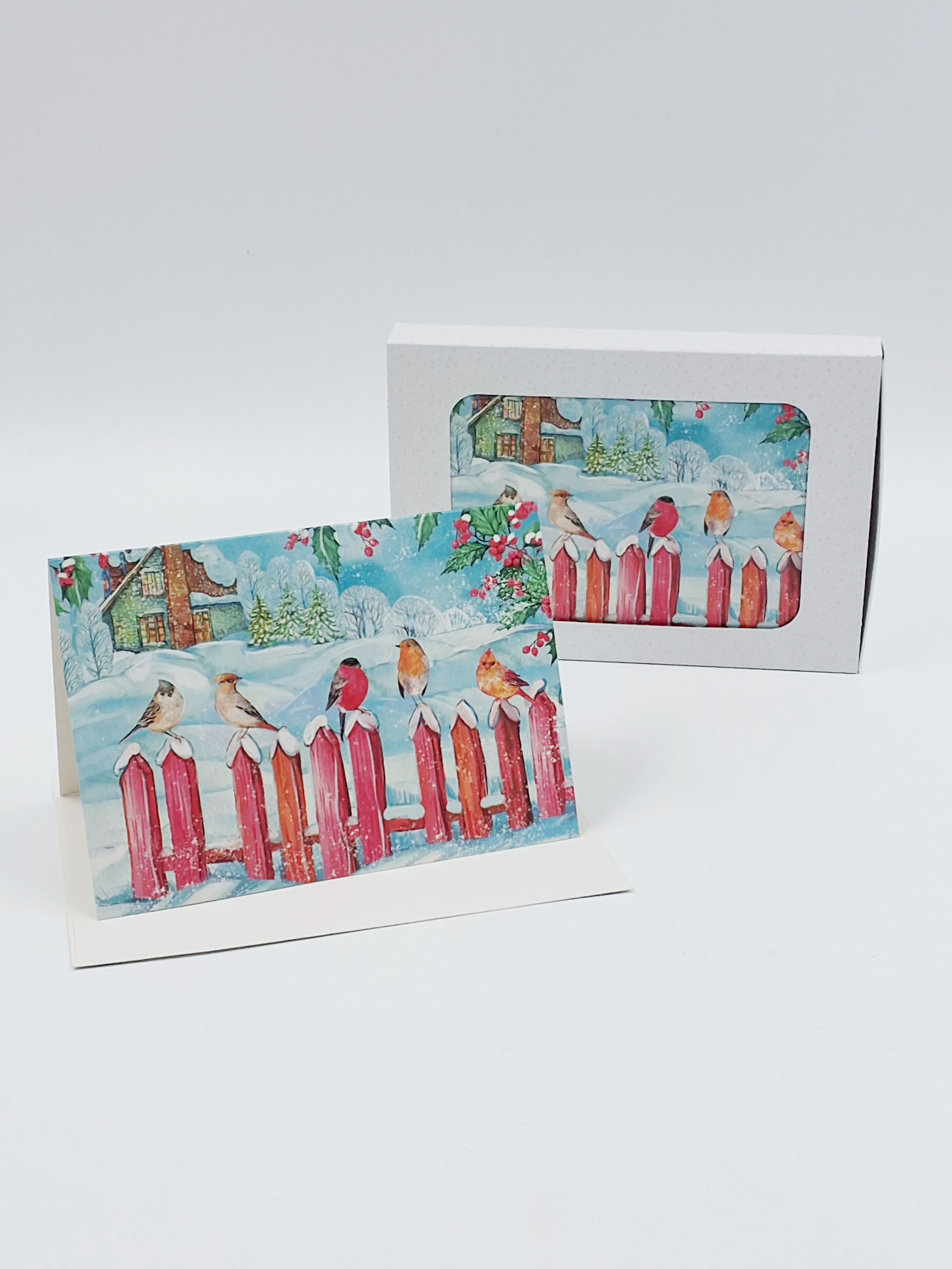 Kerstkaarten doosje 10x vogeltjes op hek (F13113)