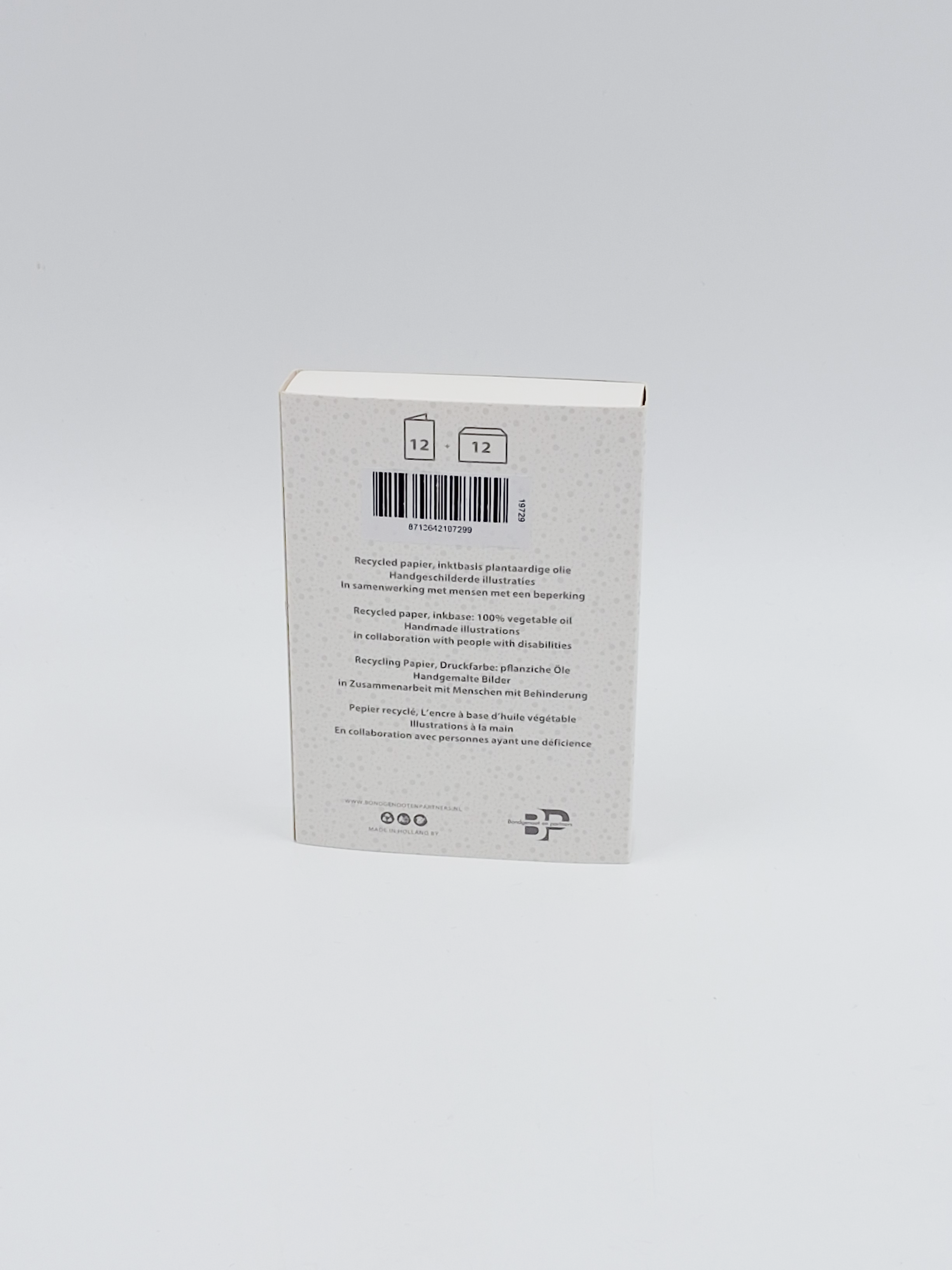 Onze kerstkaarten zijn gemaakt van gerecycled papier en bedrukt met inkt op basis van plantaardige olie.