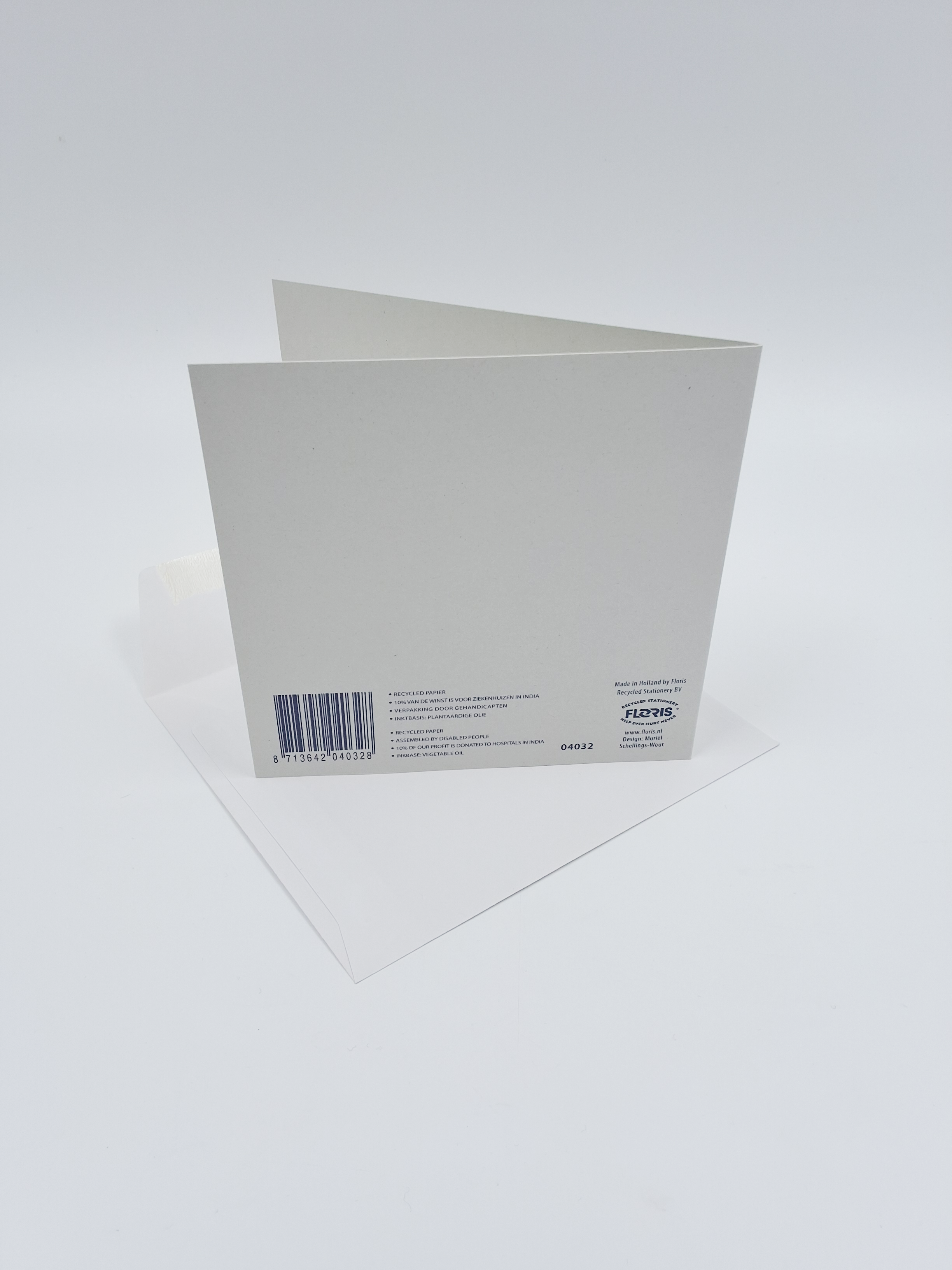Onze wenskaarten zijn gemaakt van gerecycled papier en bedrukt met inkt op basis van plantaardige olie.
