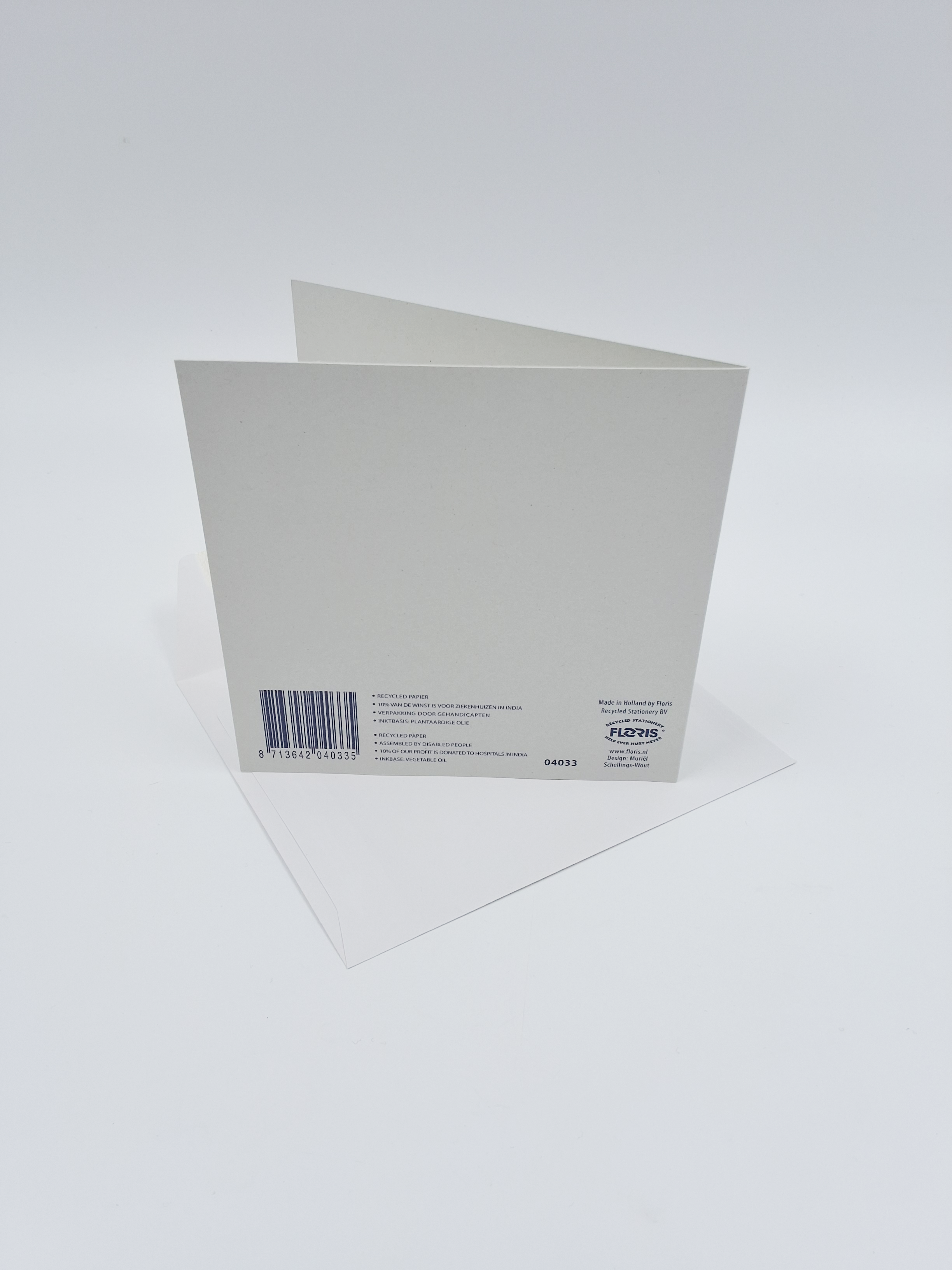Onze wenskaarten zijn gemaakt van gerecycled papier en bedrukt met inkt op basis van plantaardige olie.