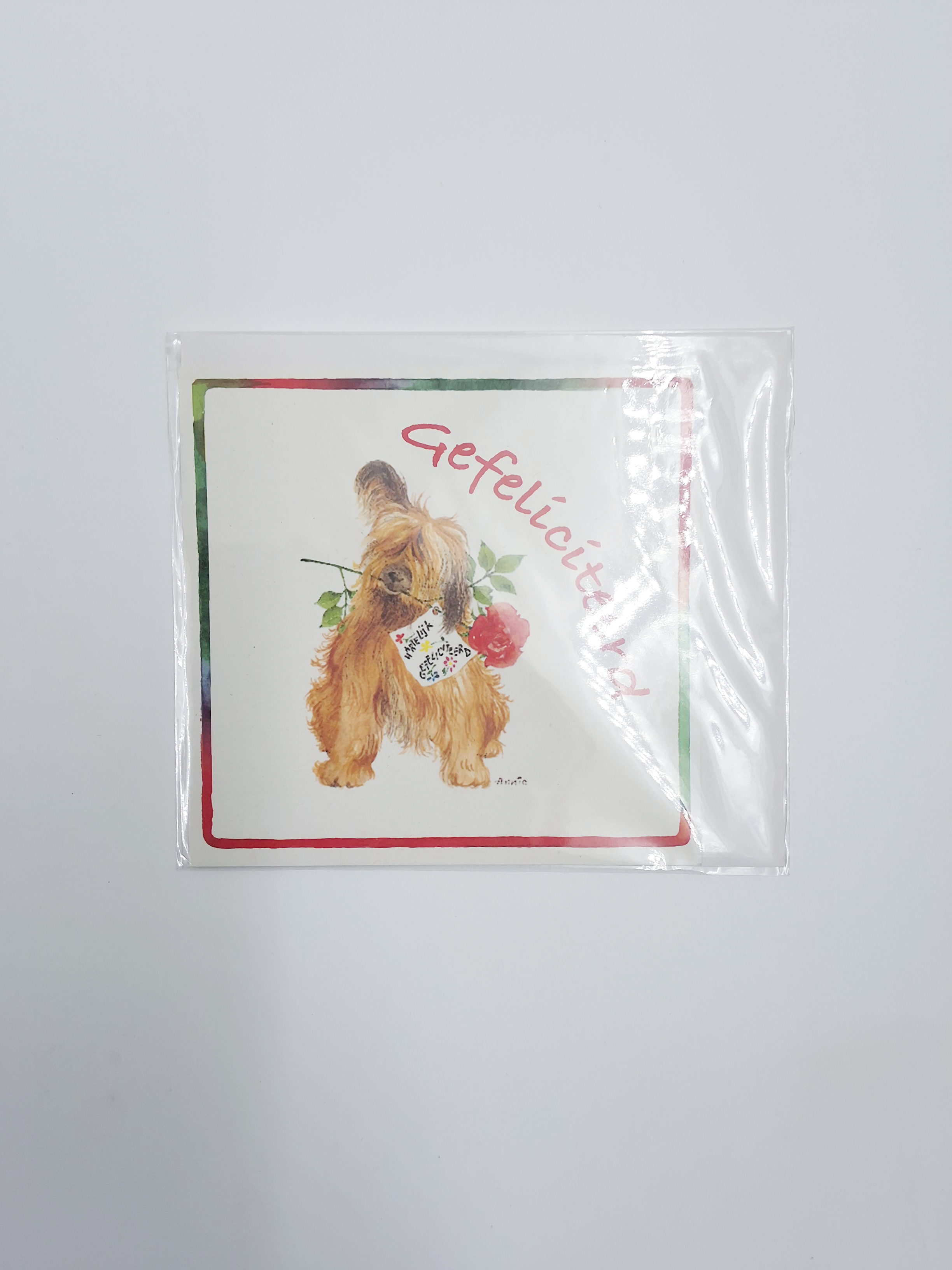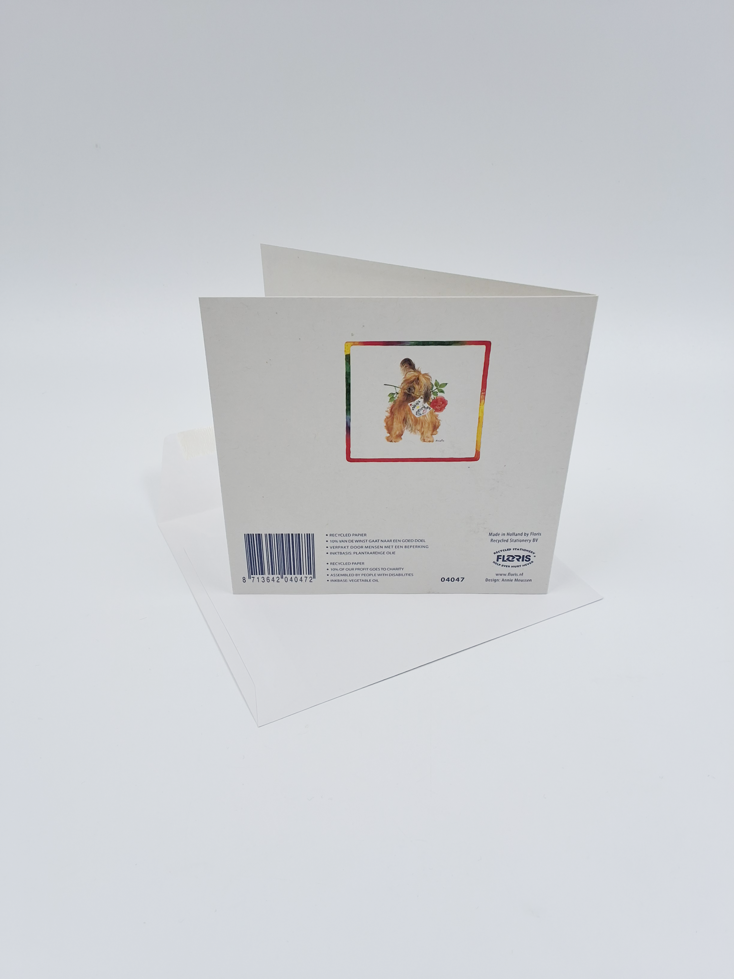 Vierkante wenskaart hond roos, "Gefeliciteerd"