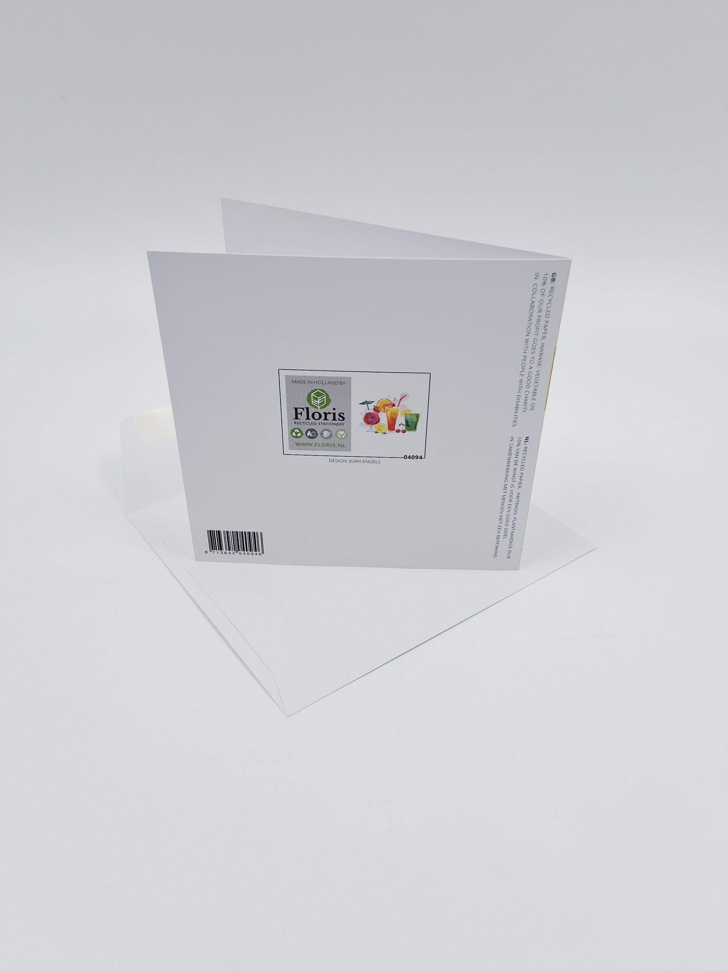 Onze wenskaarten zijn gemaakt van gerecycled papier en bedrukt met inkt op basis van plantaardige olie.