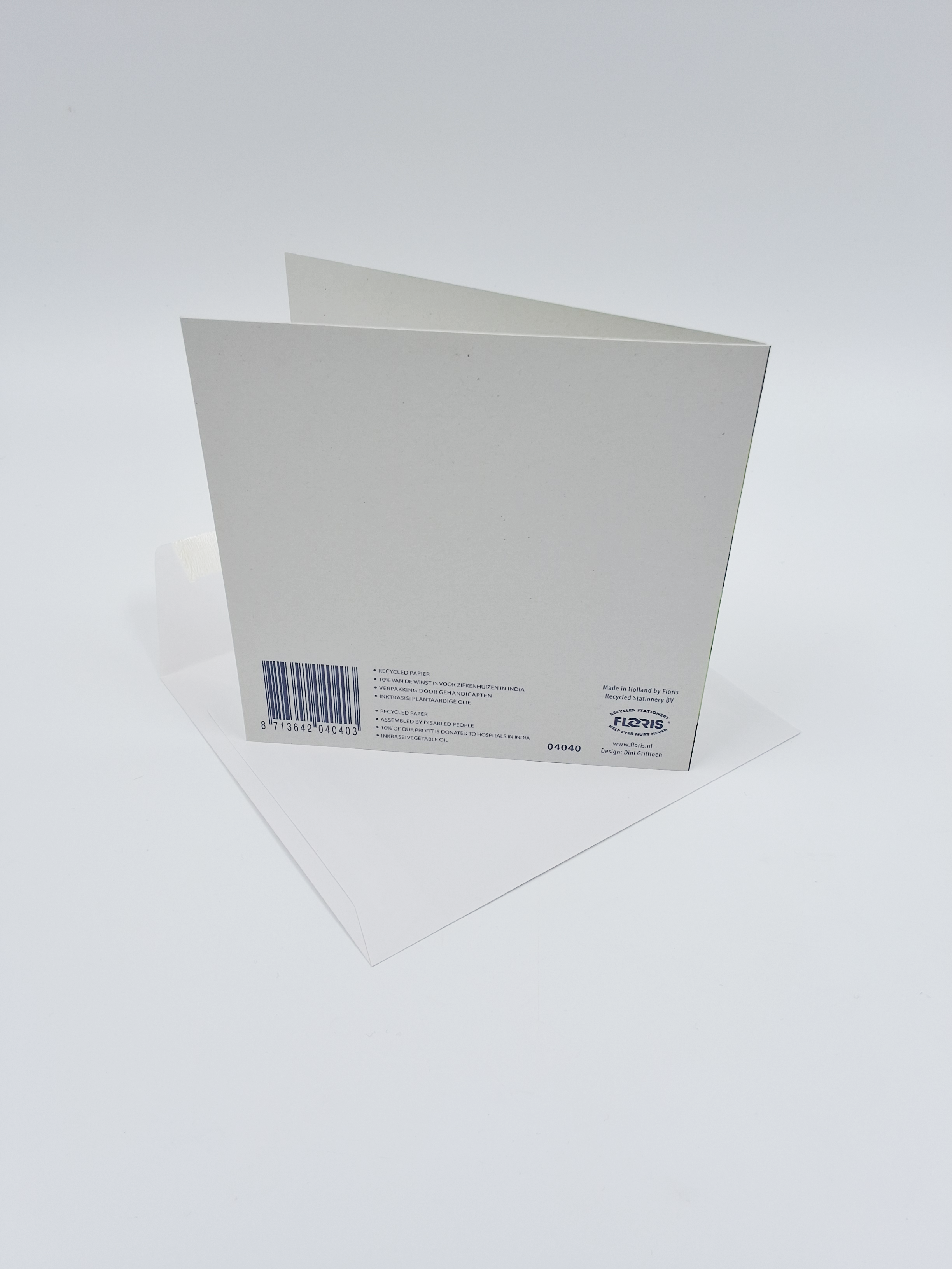 Onze wenskaarten zijn gemaakt van gerecycled papier en bedrukt met inkt op basis van plantaardige olie.