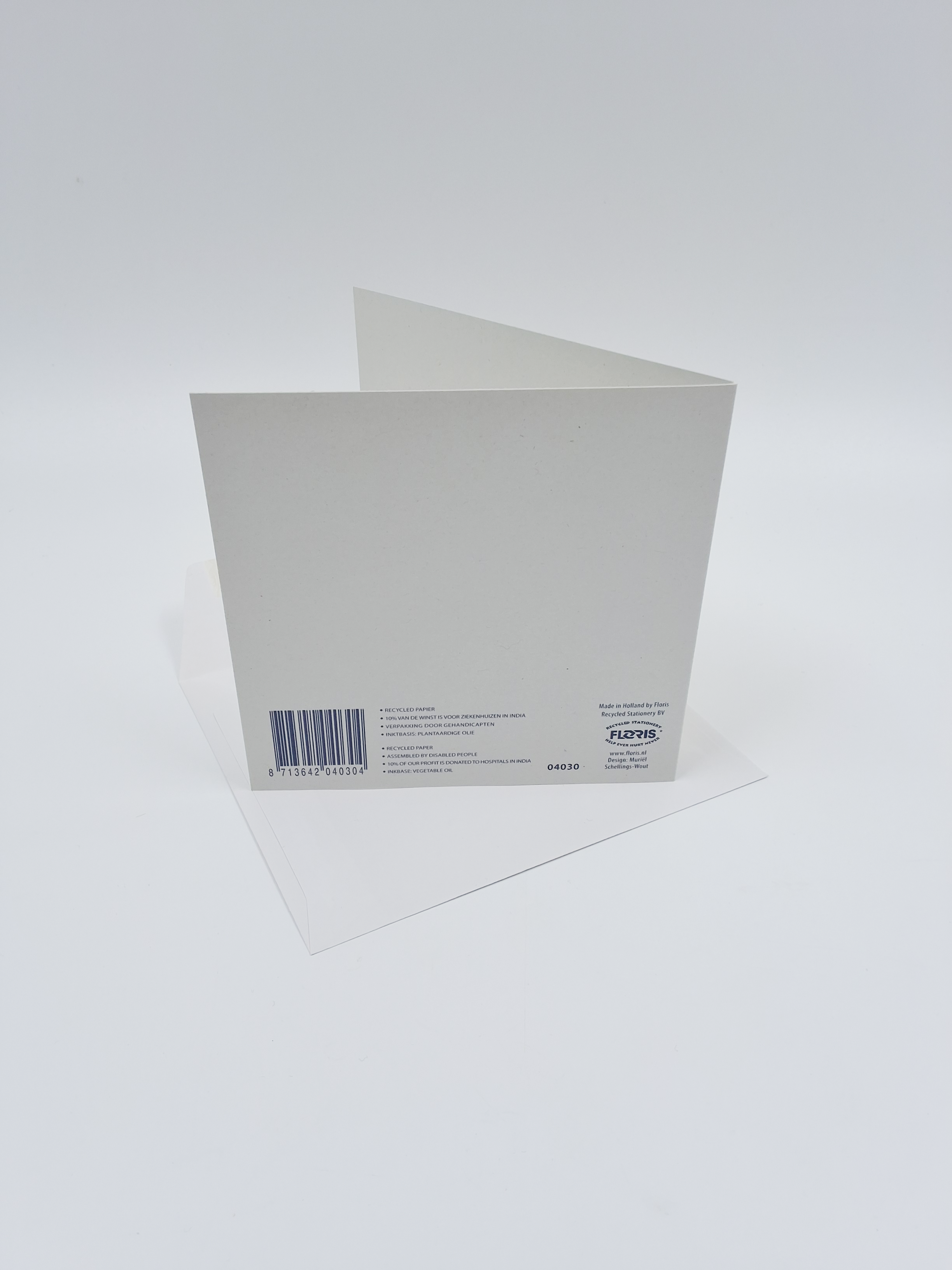 Onze wenskaarten zijn gemaakt van gerecycled papier en bedrukt met inkt op basis van plantaardige olie.