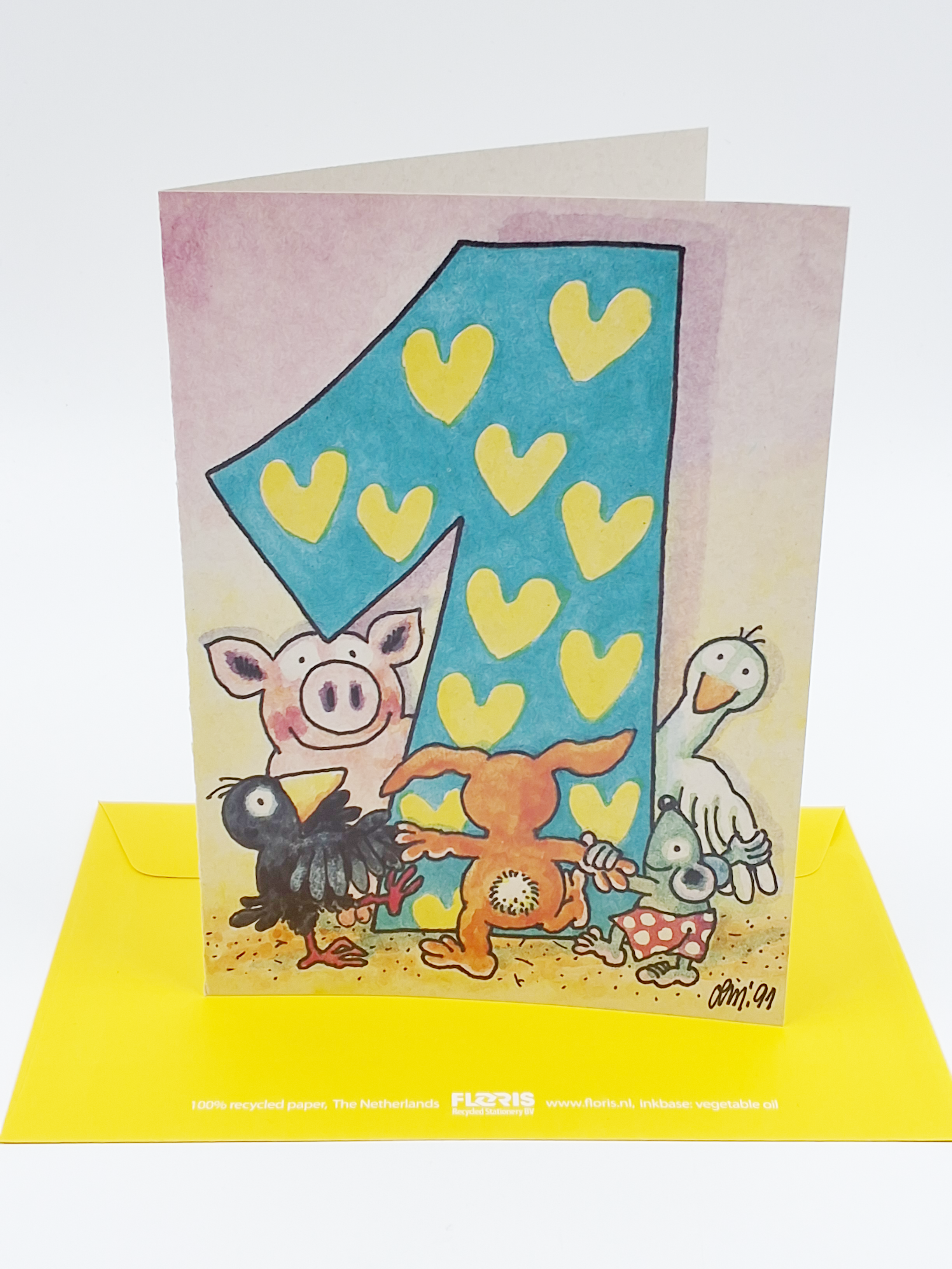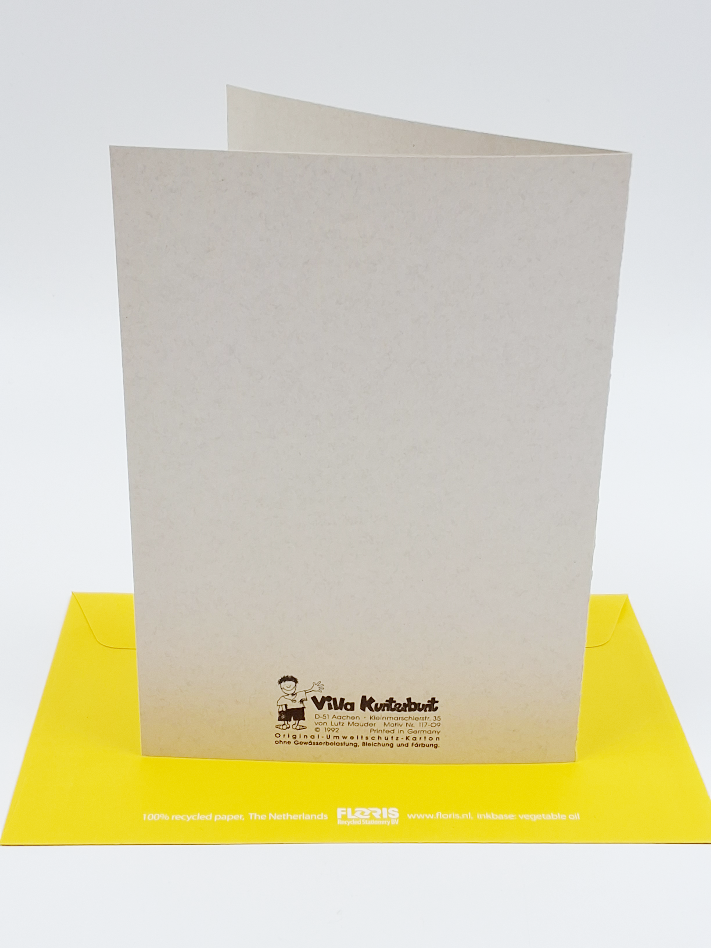Onze wenskaarten zijn gemaakt van gerecycled papier en bedrukt met inkt op basis van plantaardige olie.