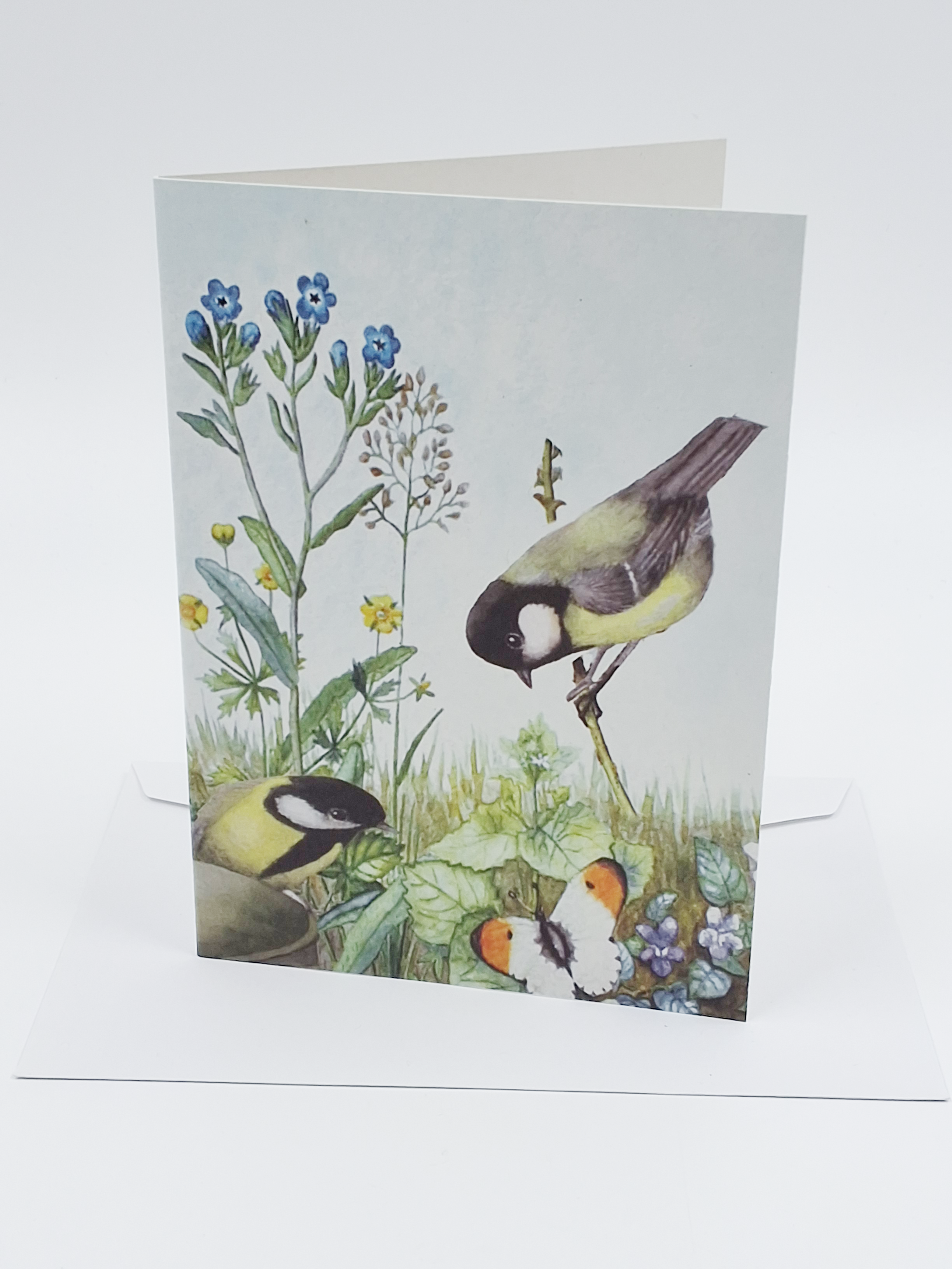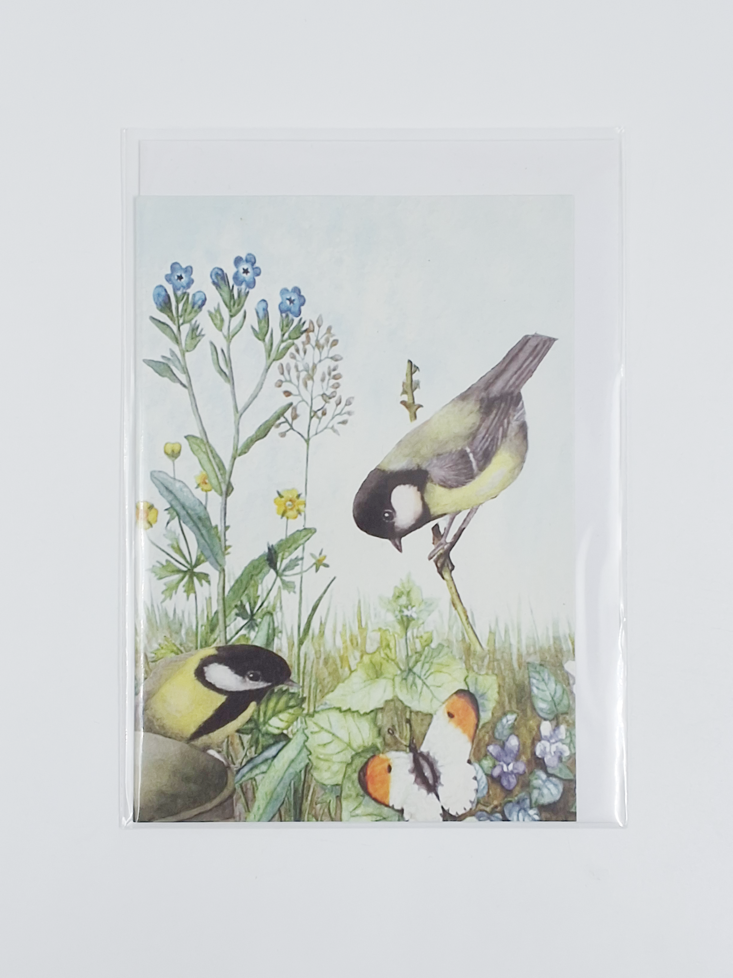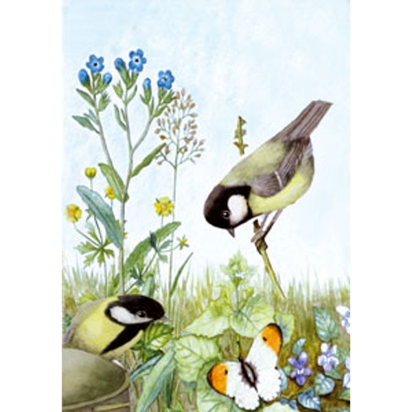Wenskaart 2 koolmeesjes vergeetmeniet