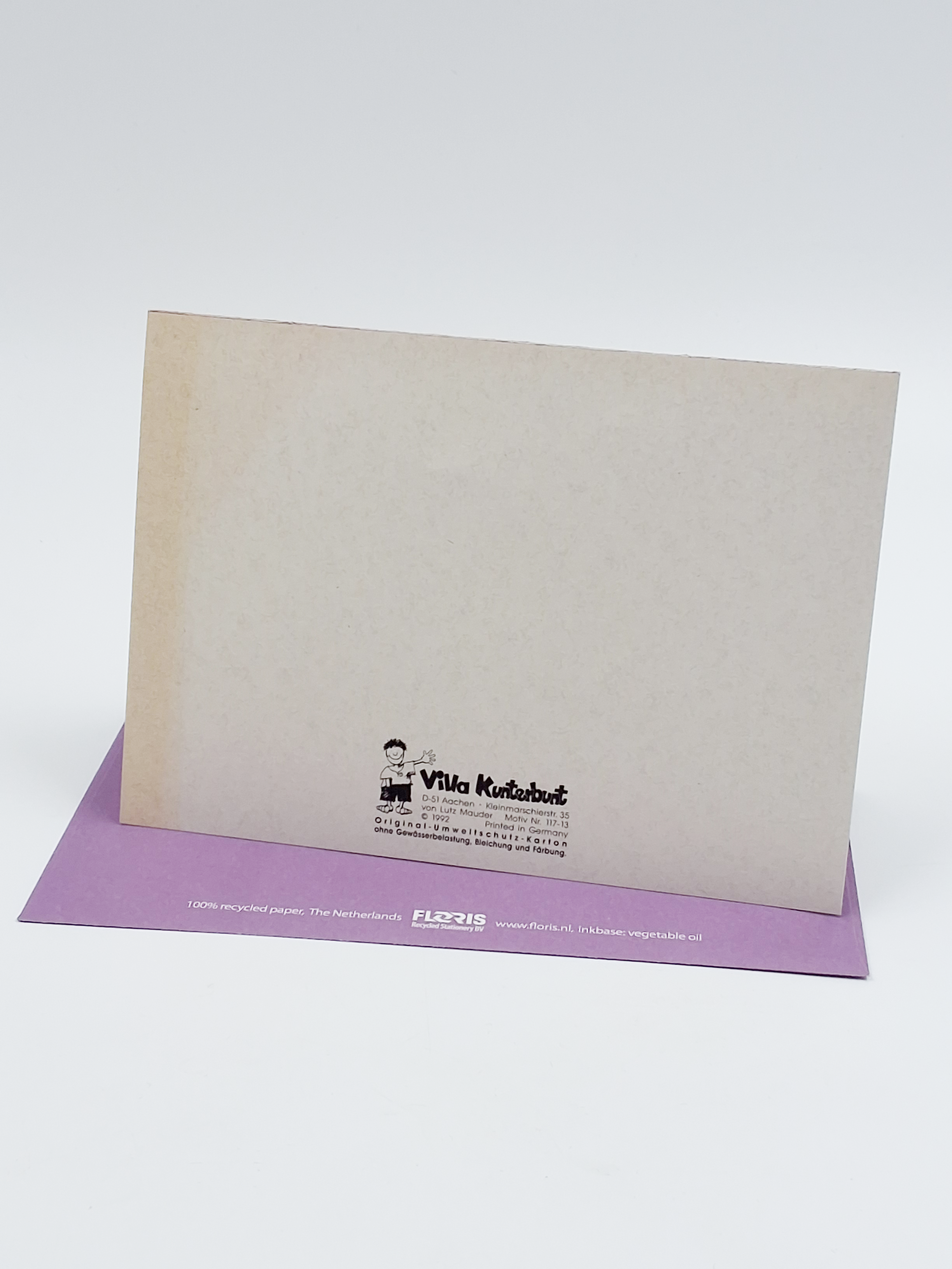 Onze wenskaarten zijn gemaakt van gerecycled papier en bedrukt met inkt op basis van plantaardige olie.