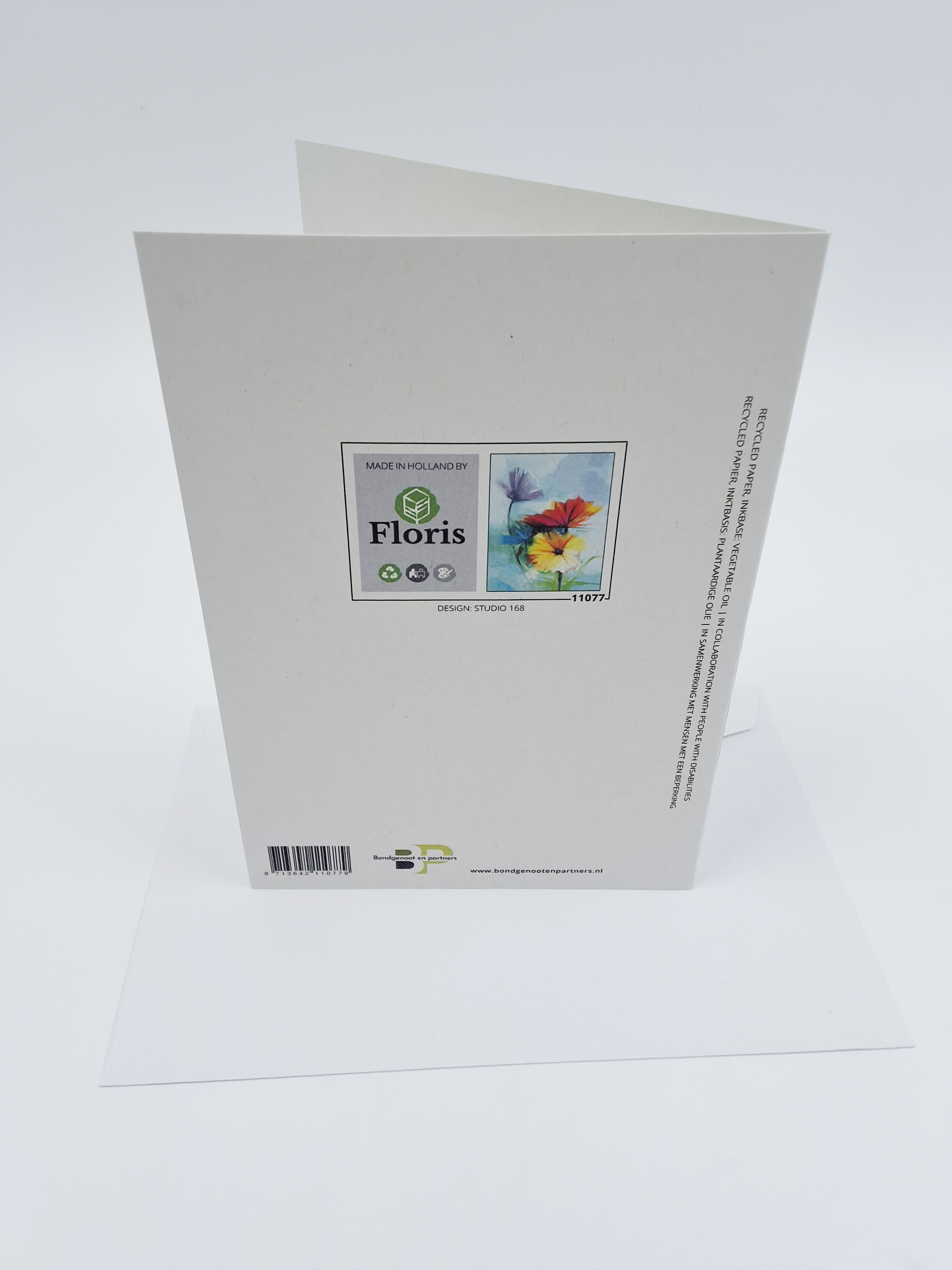 Onze wenskaarten zijn gemaakt van gerecycled papier en bedrukt met inkt op basis van plantaardige olie.