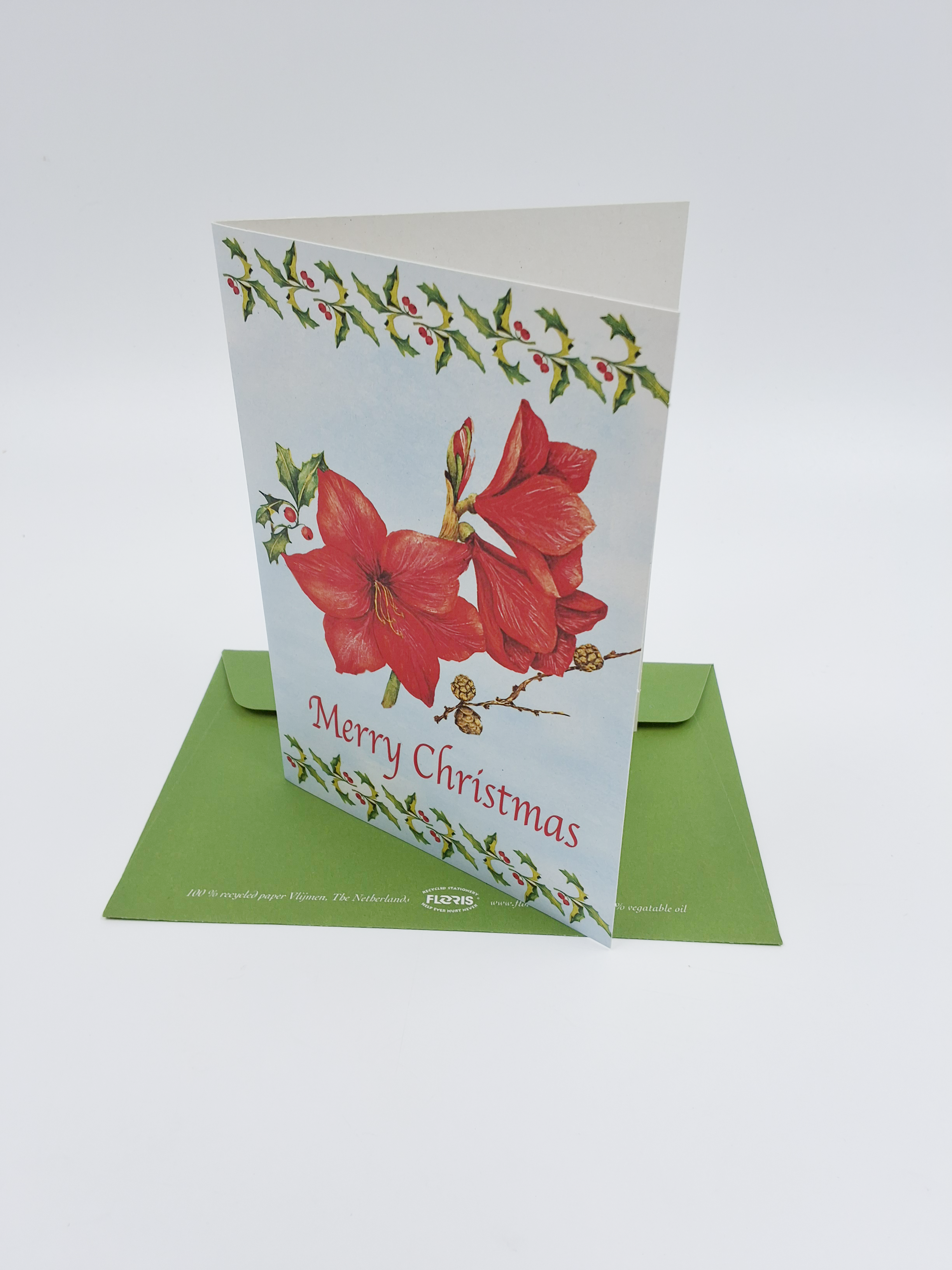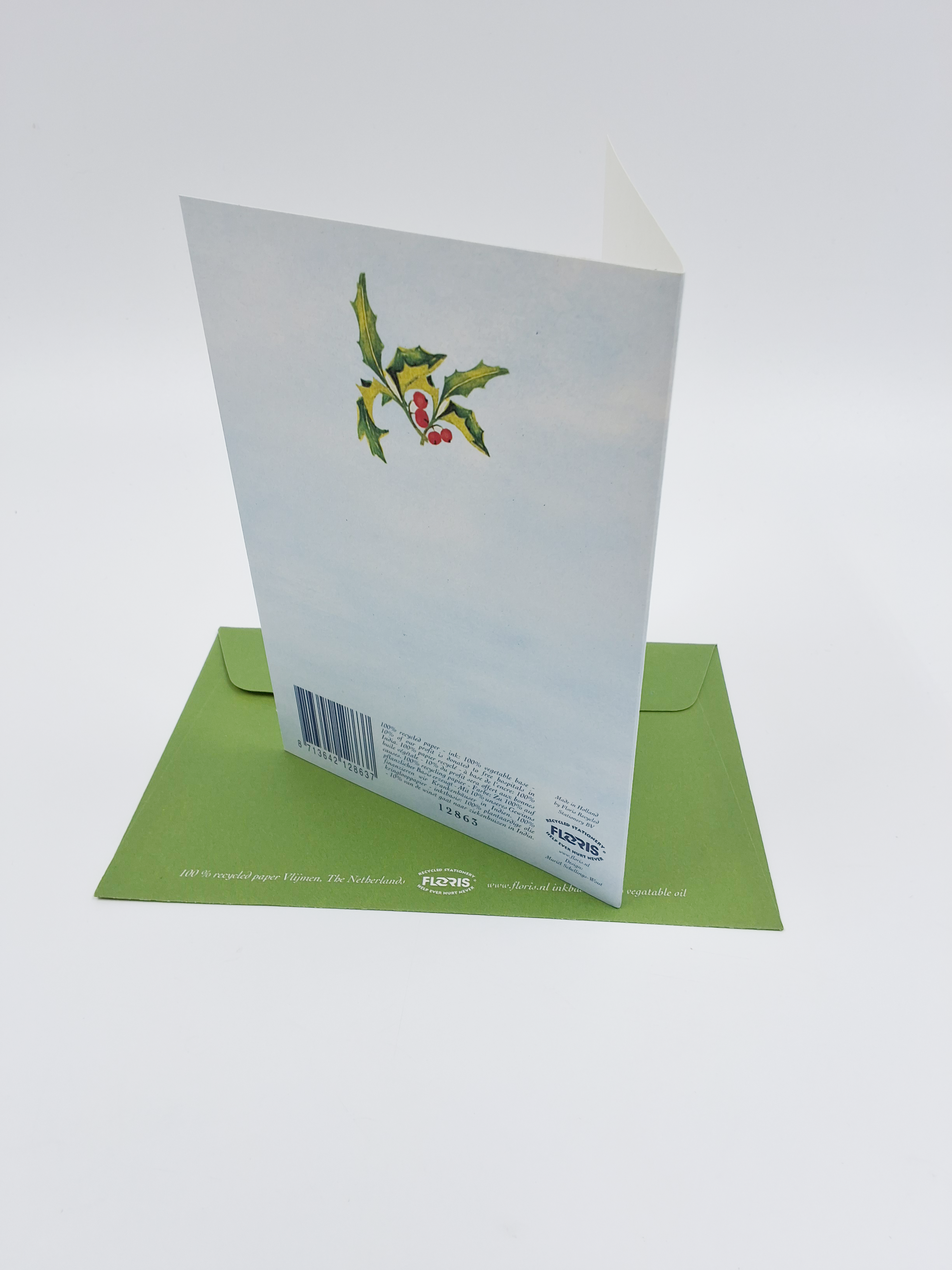 Onze kerstkaarten zijn gemaakt van gerecycled papier en bedrukt met inkt op basis van plantaardige olie.