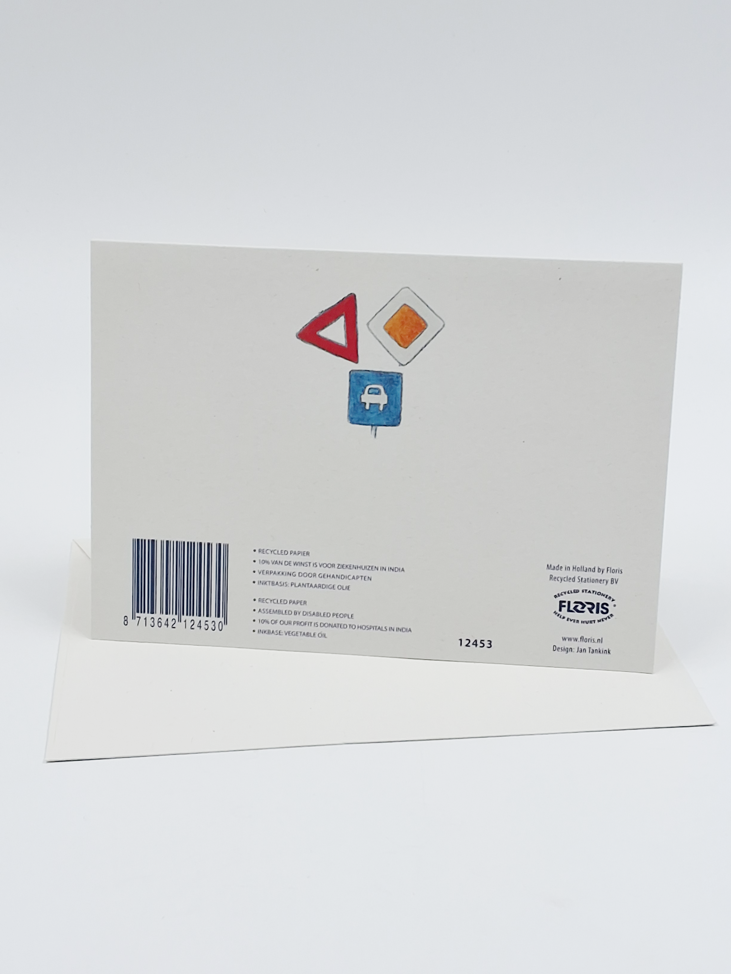Onze wenskaarten zijn gemaakt van gerecycled papier en bedrukt met inkt op basis van plantaardige olie.