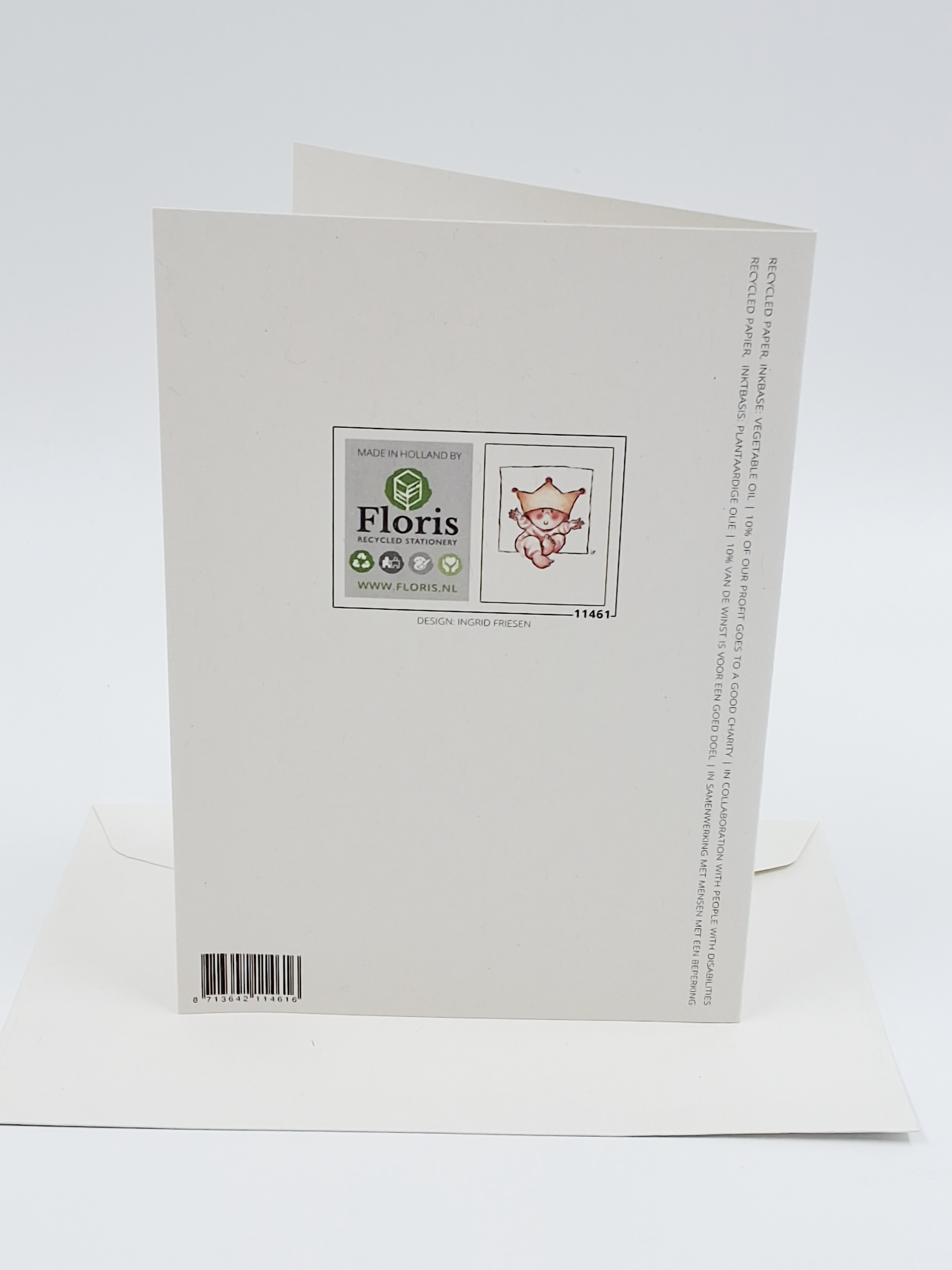 Onze wenskaarten zijn gemaakt van gerecycled papier en bedrukt met inkt op basis van plantaardige olie.