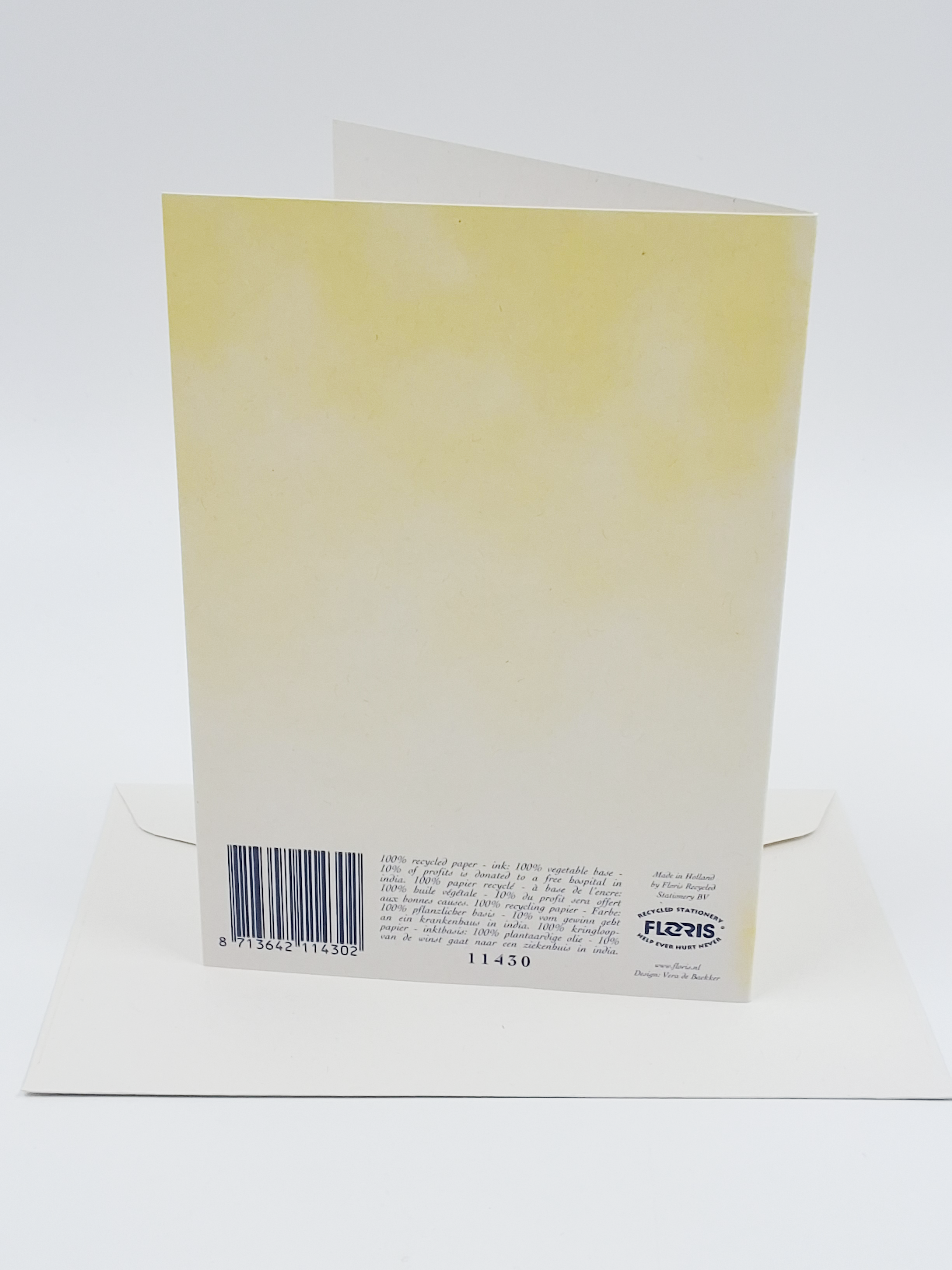 Onze wenskaarten zijn gemaakt van gerecycled papier en bedrukt met inkt op basis van plantaardige olie.