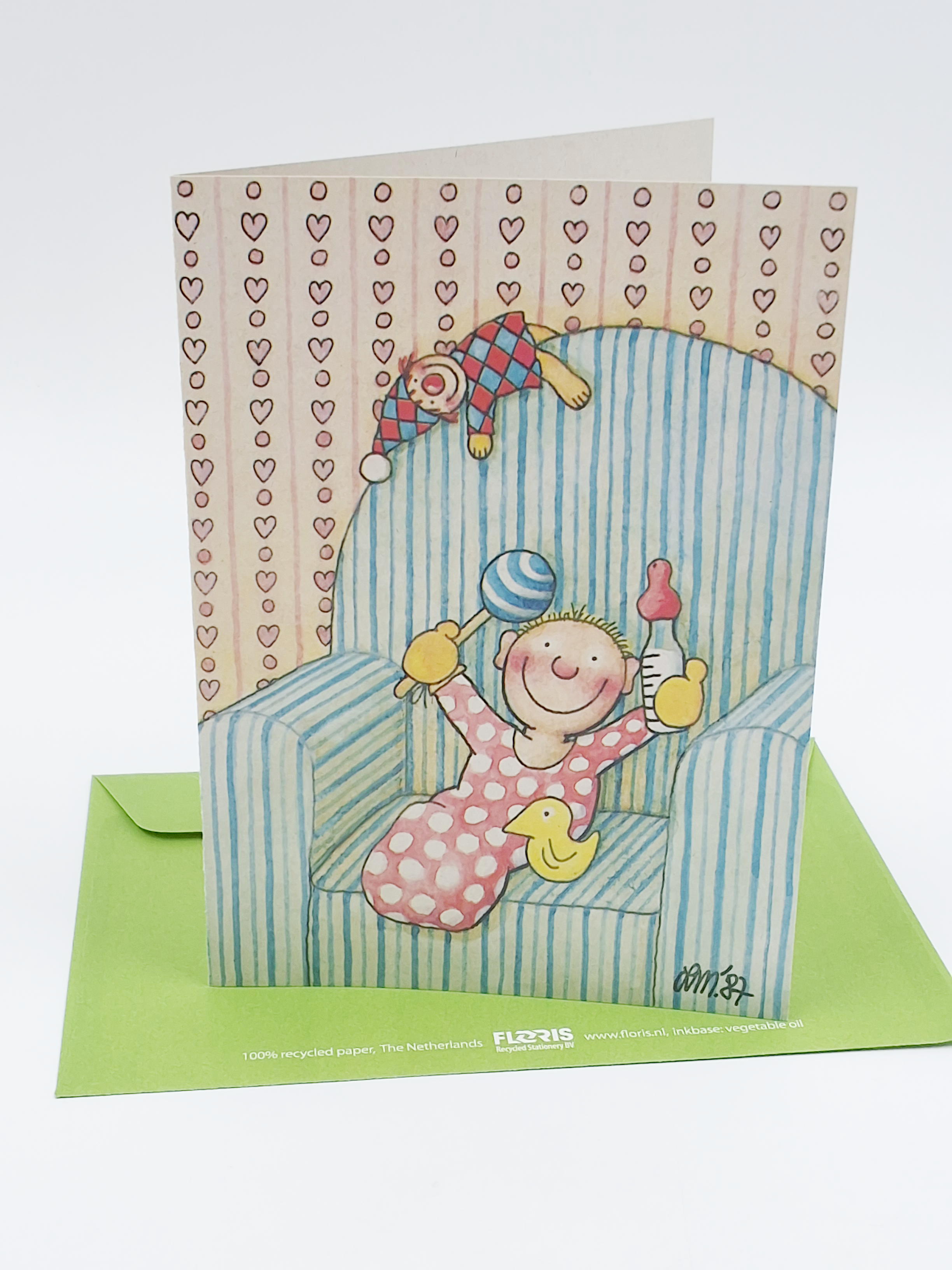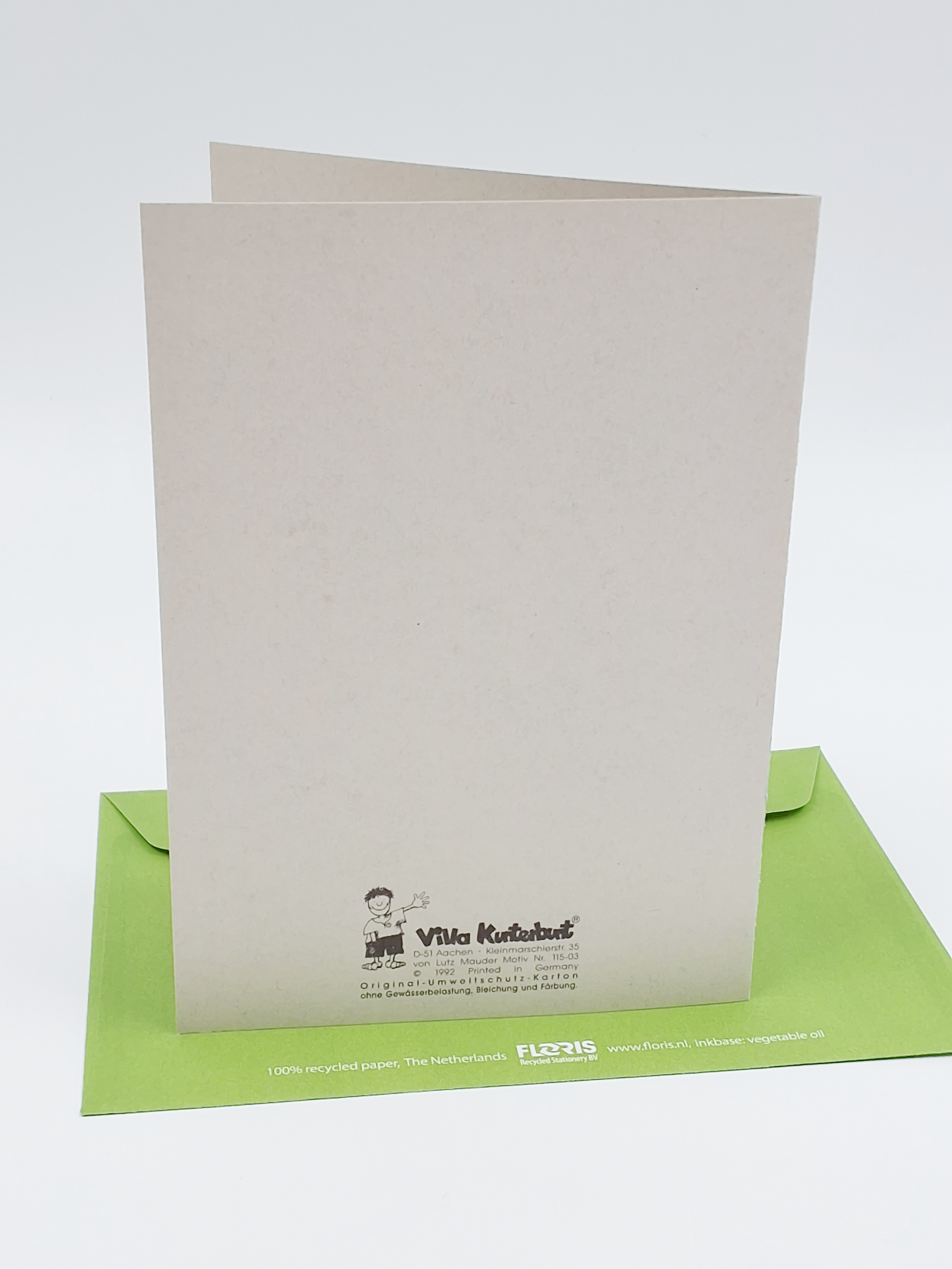 Onze wenskaarten zijn gemaakt van gerecycled papier en bedrukt met inkt op basis van plantaardige olie.