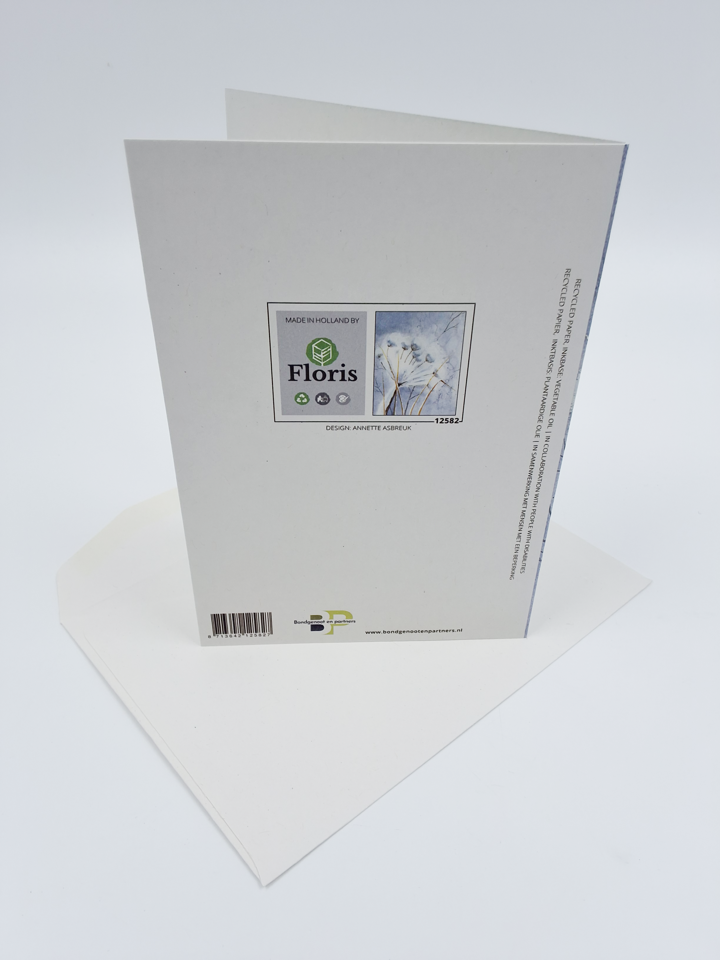 Onze wenskaarten zijn gemaakt van gerecycled papier en bedrukt met inkt op basis van plantaardige olie.