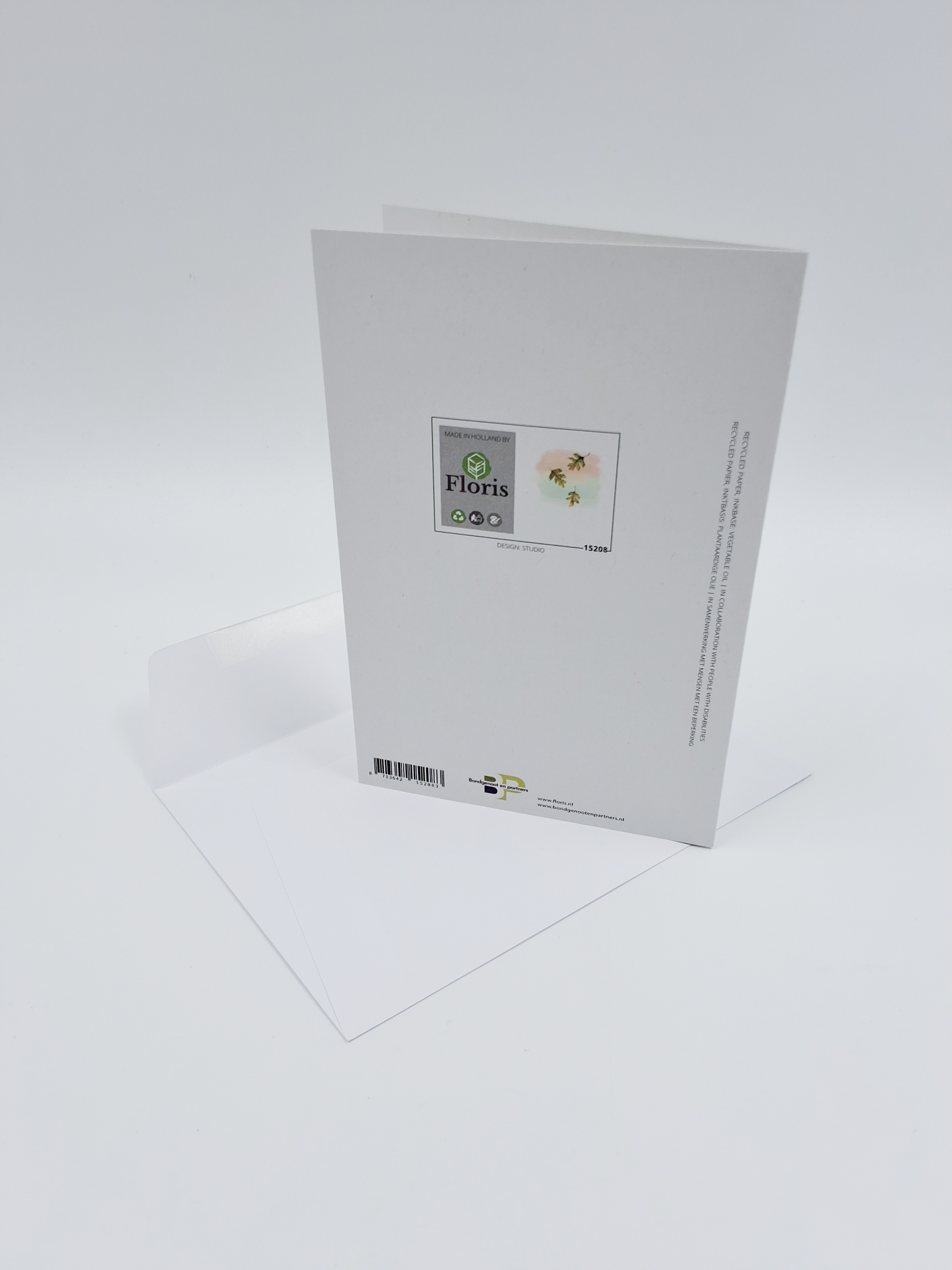 Deze wenskaart is iets groter dan een standaard wenskaart en heeft geen plastiek verpakking. Elke kaart komt met een passende envelop.