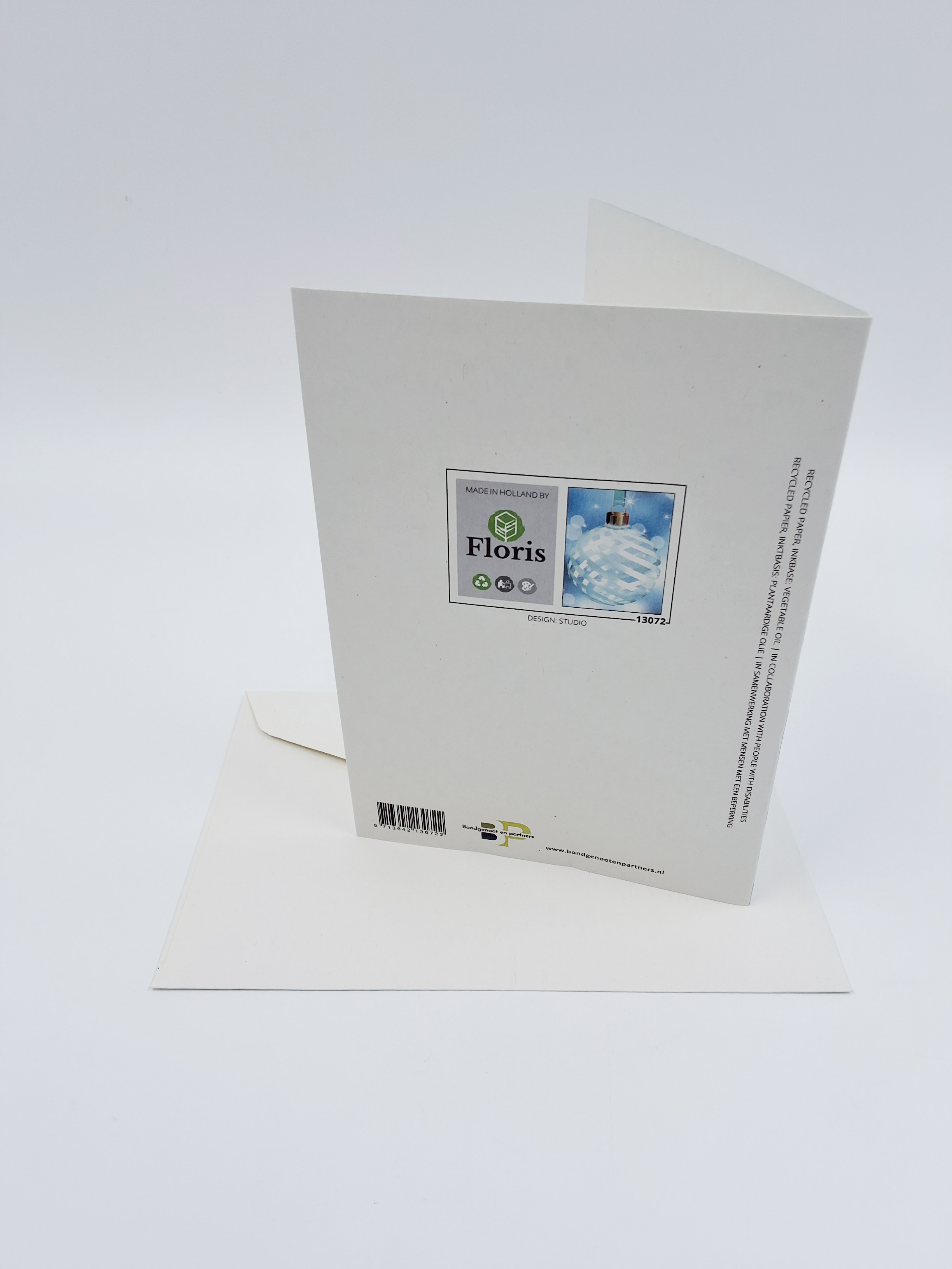 Onze kerstkaarten zijn gemaakt van gerecycled papier en bedrukt met inkt op basis van plantaardige olie.