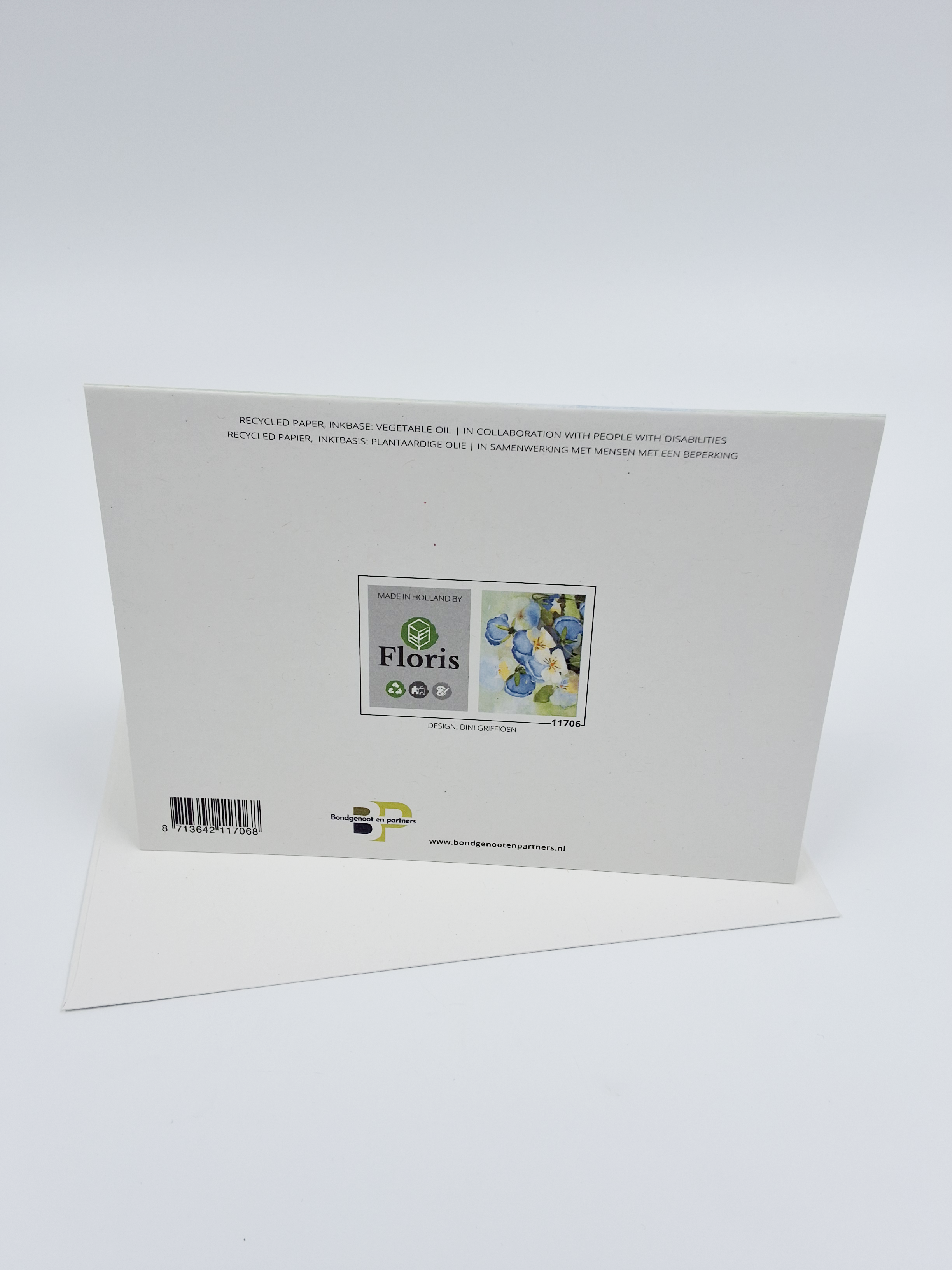 Onze wenskaarten zijn gemaakt van gerecycled papier en bedrukt met inkt op basis van plantaardige olie.