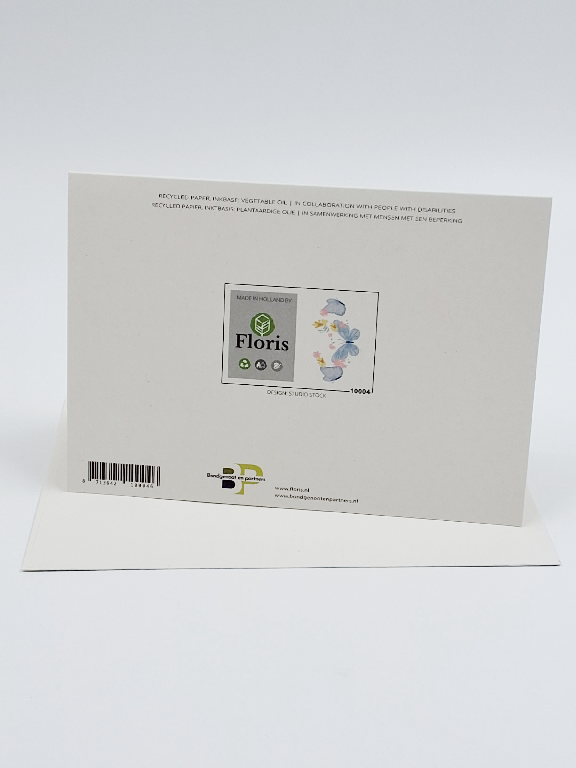 Onze wenskaarten zijn gemaakt van gerecycled papier en bedrukt met inkt op basis van plantaardige olie.