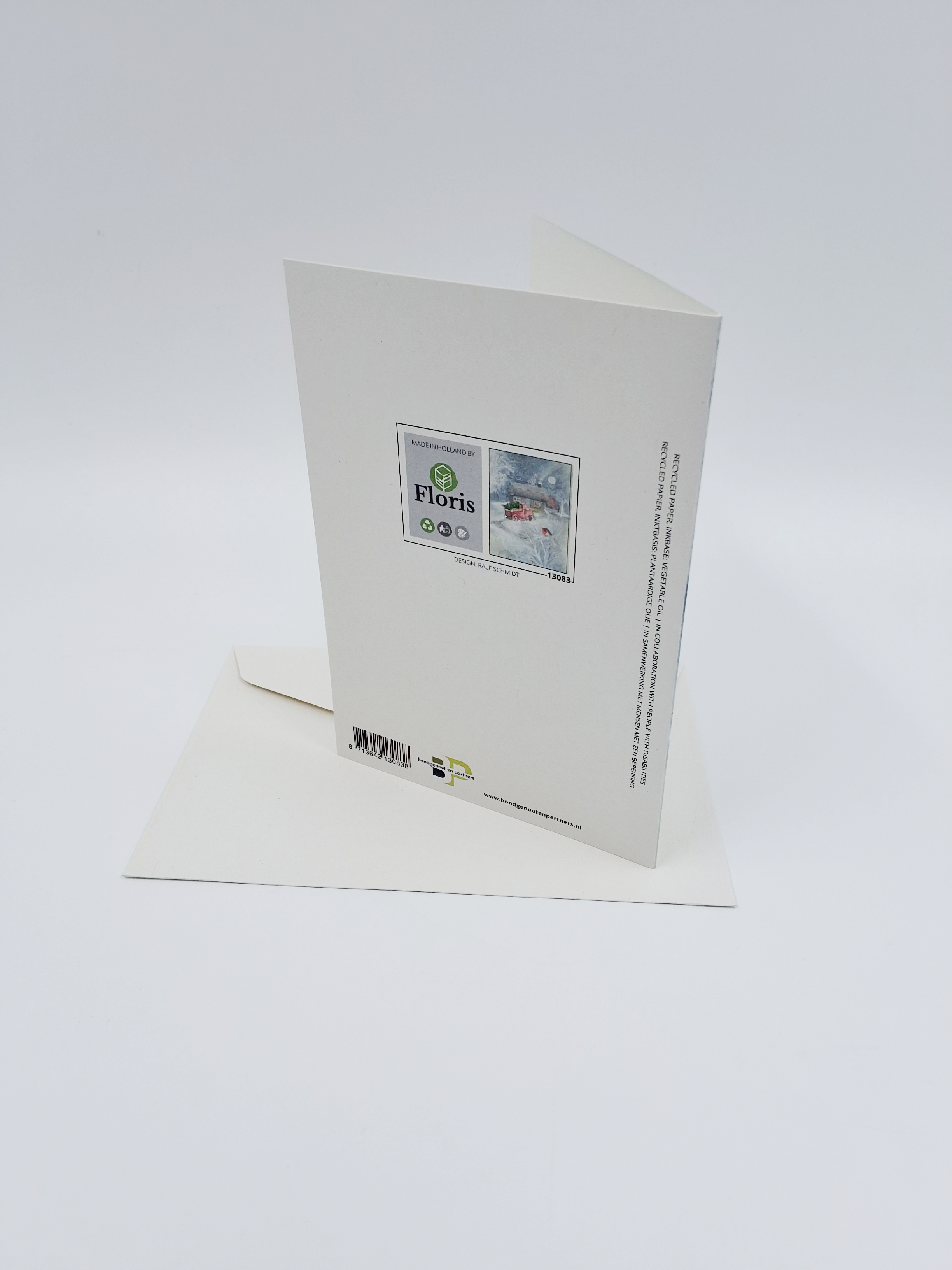 Onze kerstkaarten zijn gemaakt van gerecycled papier en bedrukt met inkt op basis van plantaardige olie.