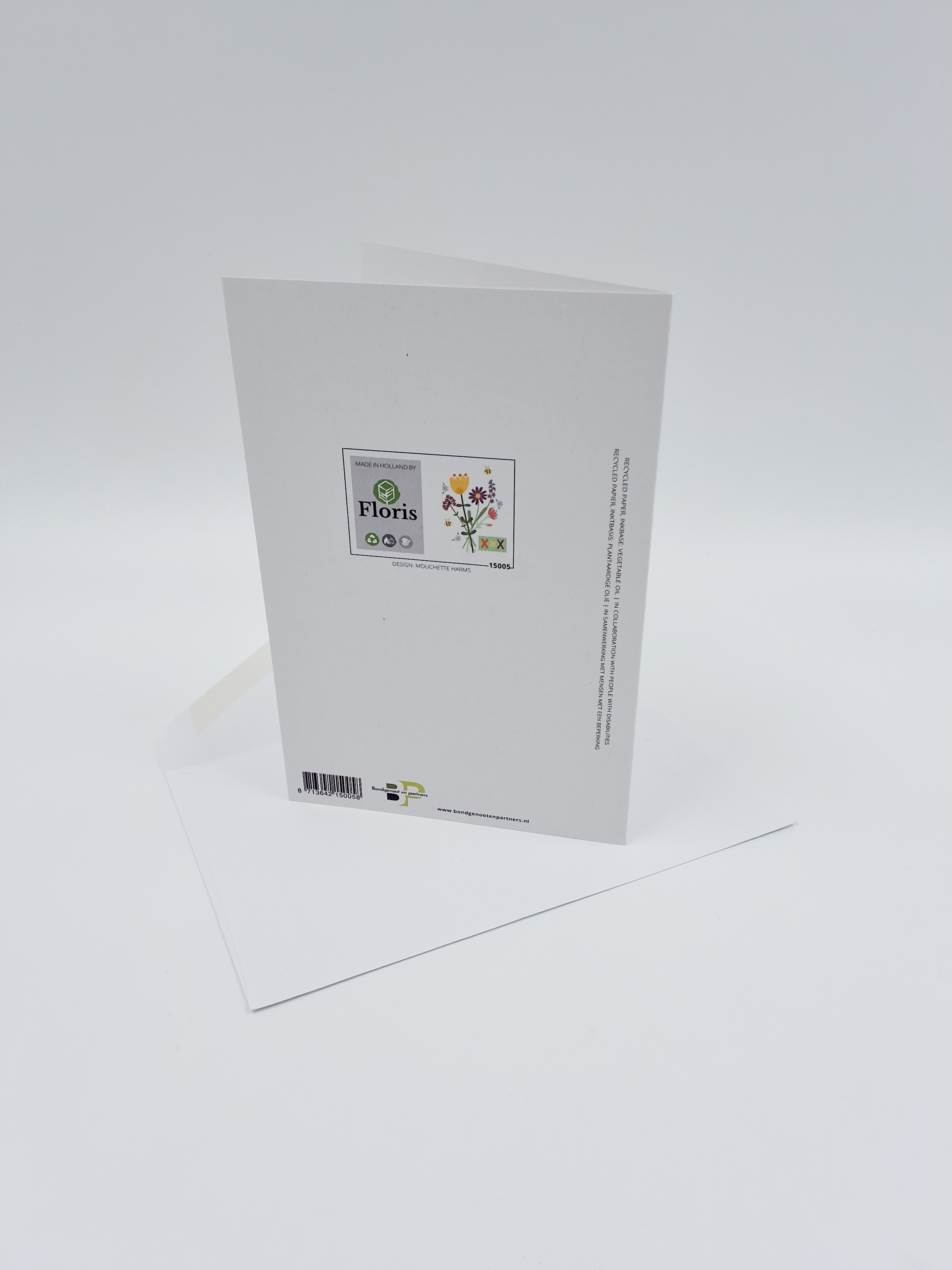 Deze wenskaart is iets groter dan een standaard wenskaart en heeft geen plastiek verpakking. Elke kaart komt met een passende envelop.