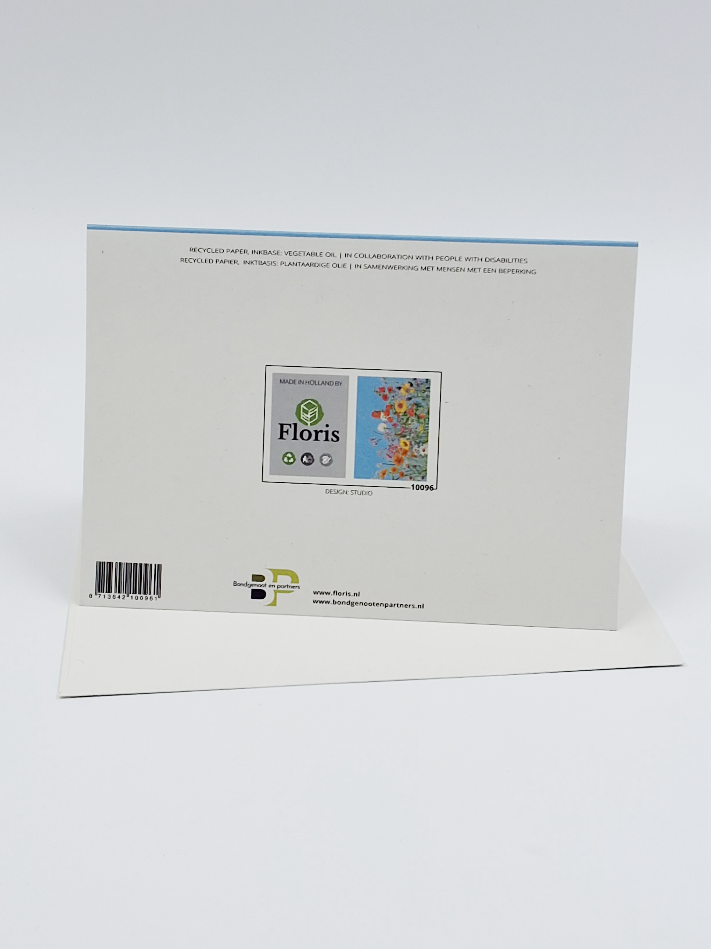 Onze wenskaarten zijn gemaakt van gerecycled papier en bedrukt met inkt op basis van plantaardige olie.