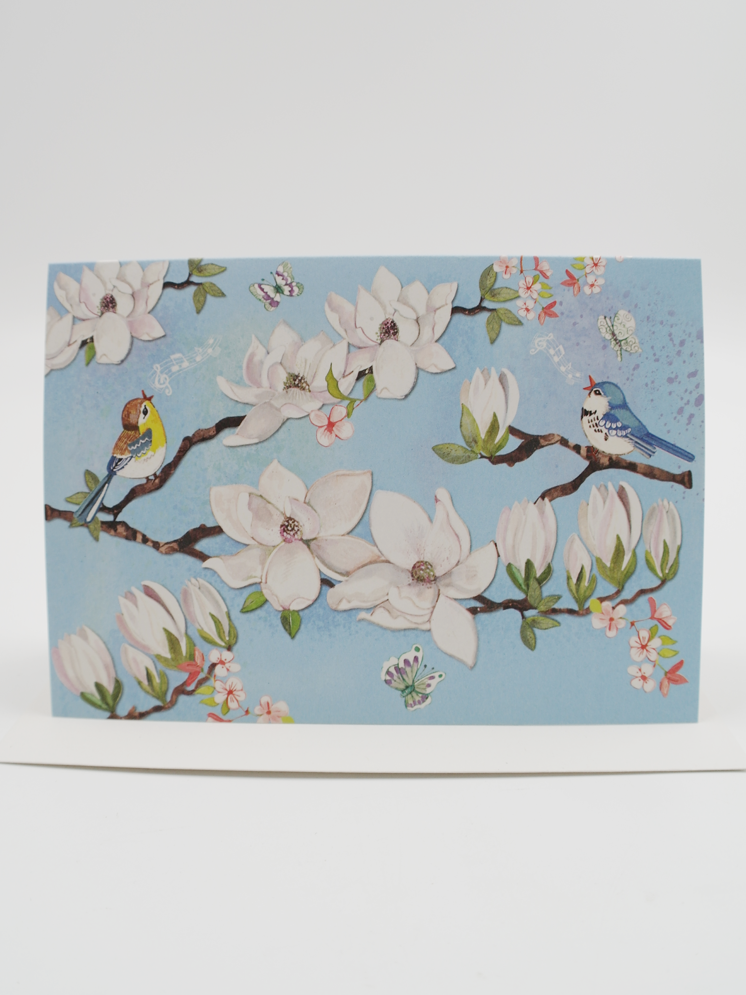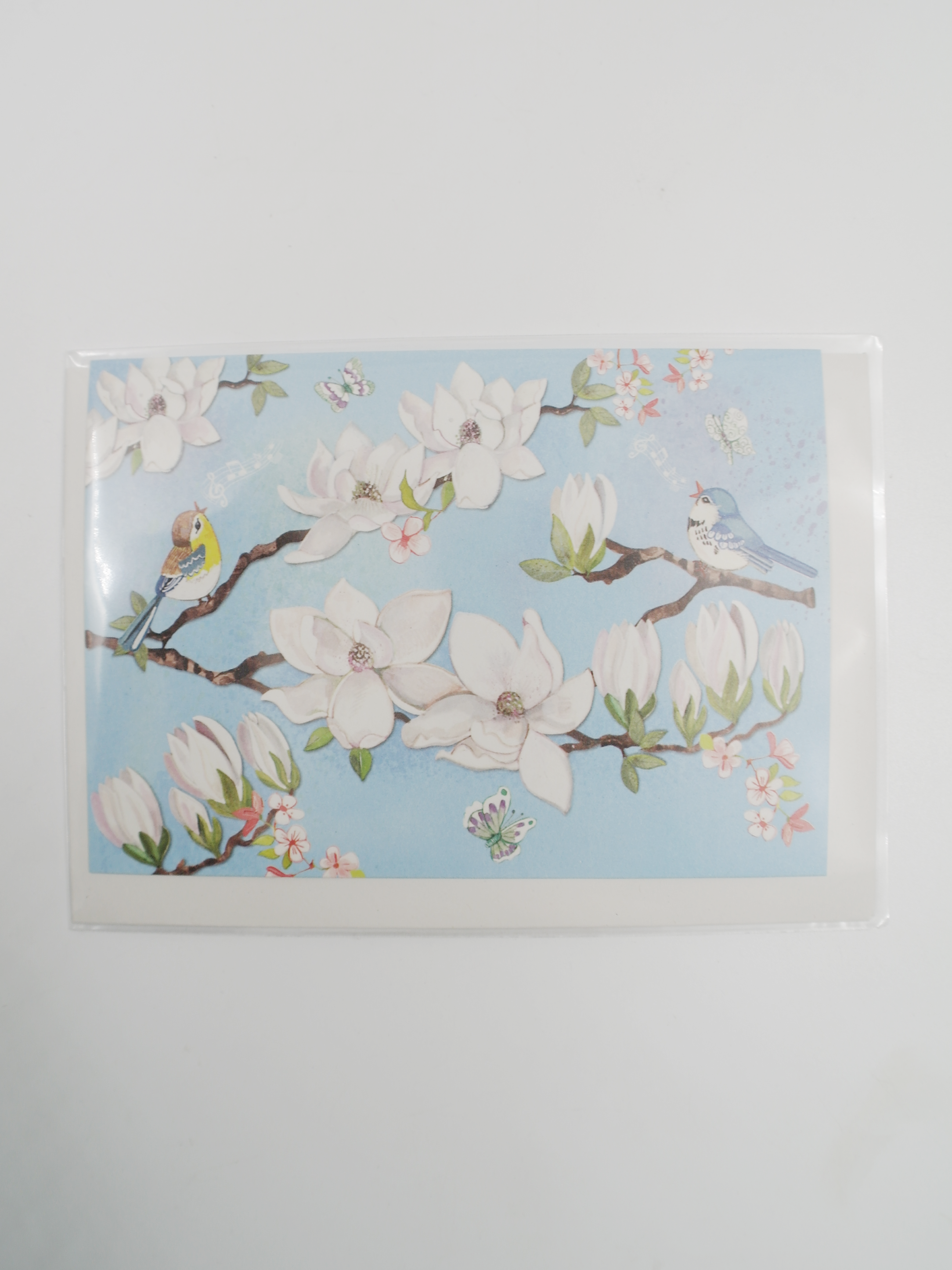 Wenskaart Bloemen en vogels, blauw