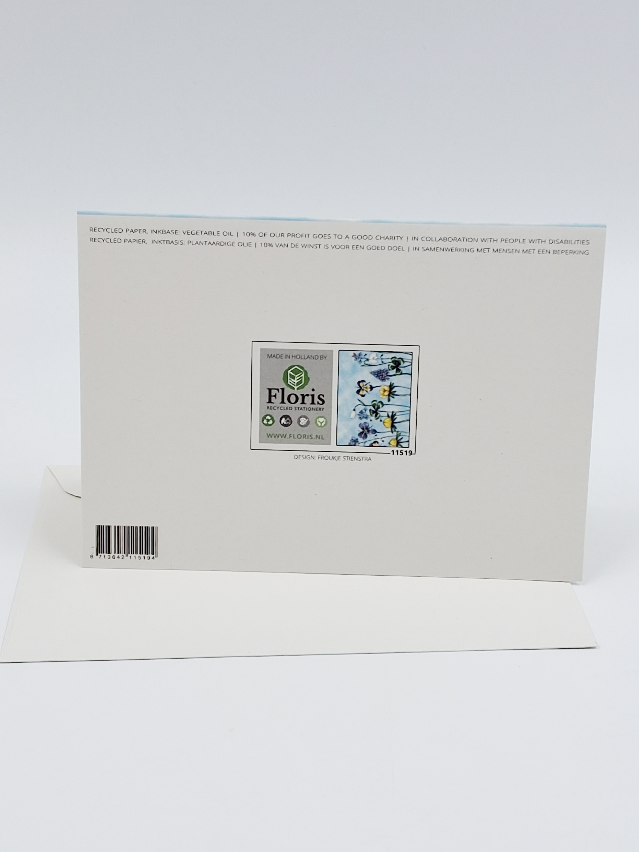 Onze wenskaarten zijn gemaakt van gerecycled papier en bedrukt met inkt op basis van plantaardige olie.