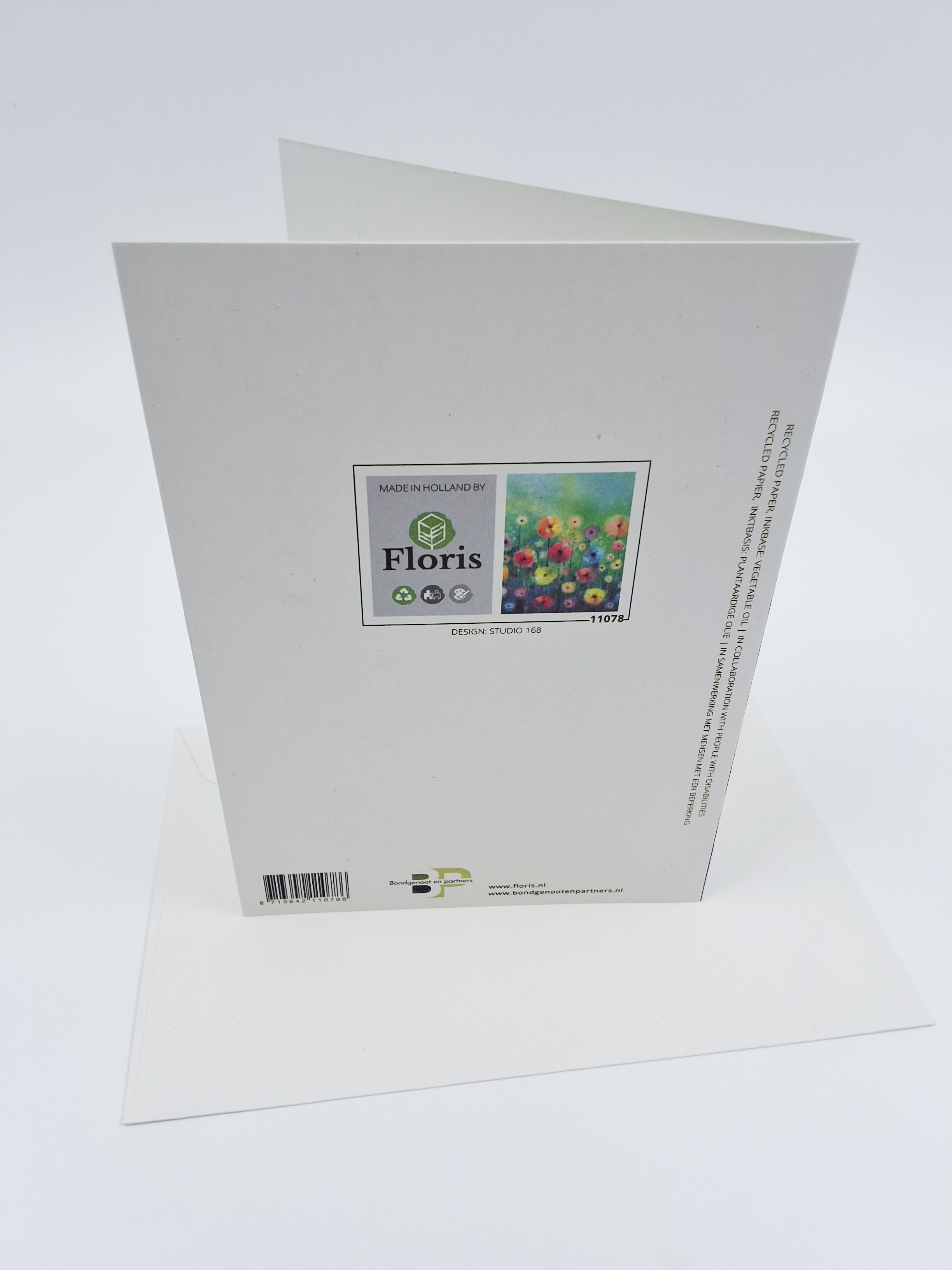 Onze wenskaarten zijn gemaakt van gerecycled papier en bedrukt met inkt op basis van plantaardige olie.