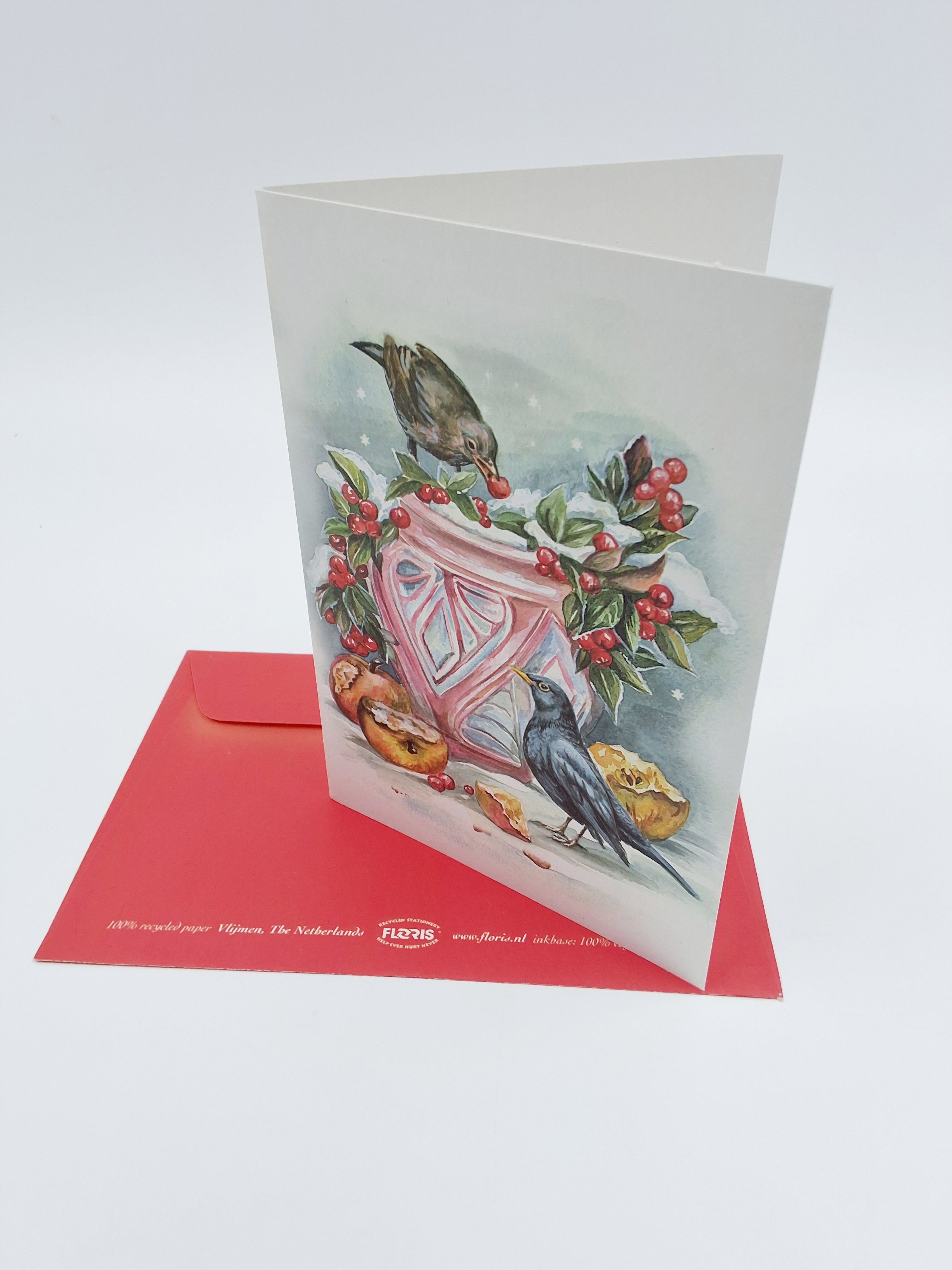Onze kerstkaarten zijn gemaakt van gerecycled papier en bedrukt met inkt op basis van plantaardige olie.