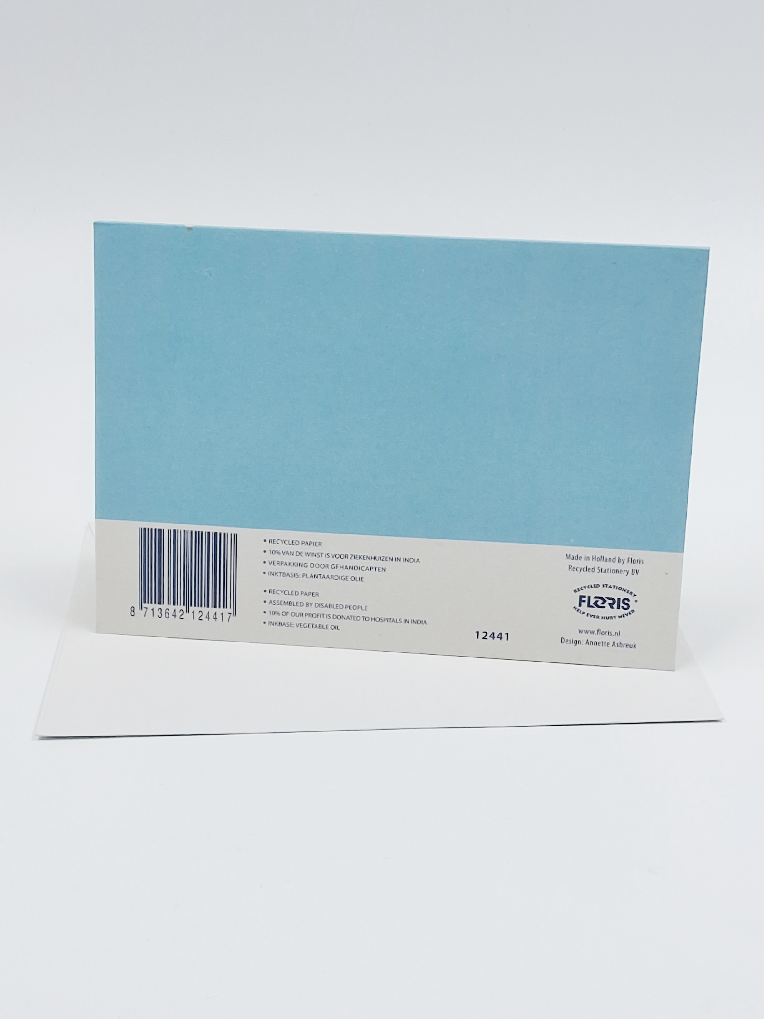 Onze wenskaarten zijn gemaakt van gerecycled papier en bedrukt met inkt op basis van plantaardige olie.