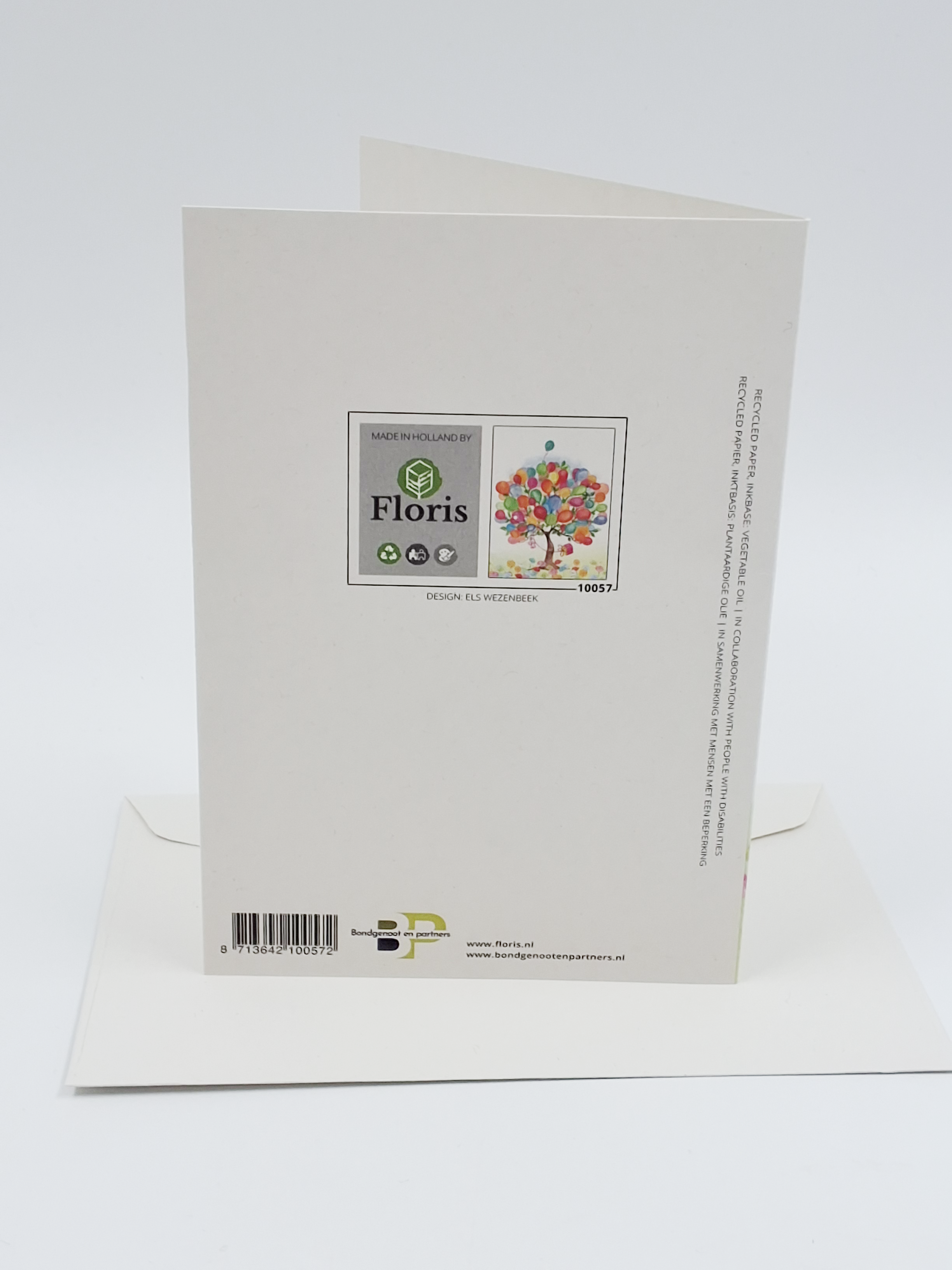 Onze wenskaarten zijn gemaakt van gerecycled papier en bedrukt met inkt op basis van plantaardige olie.