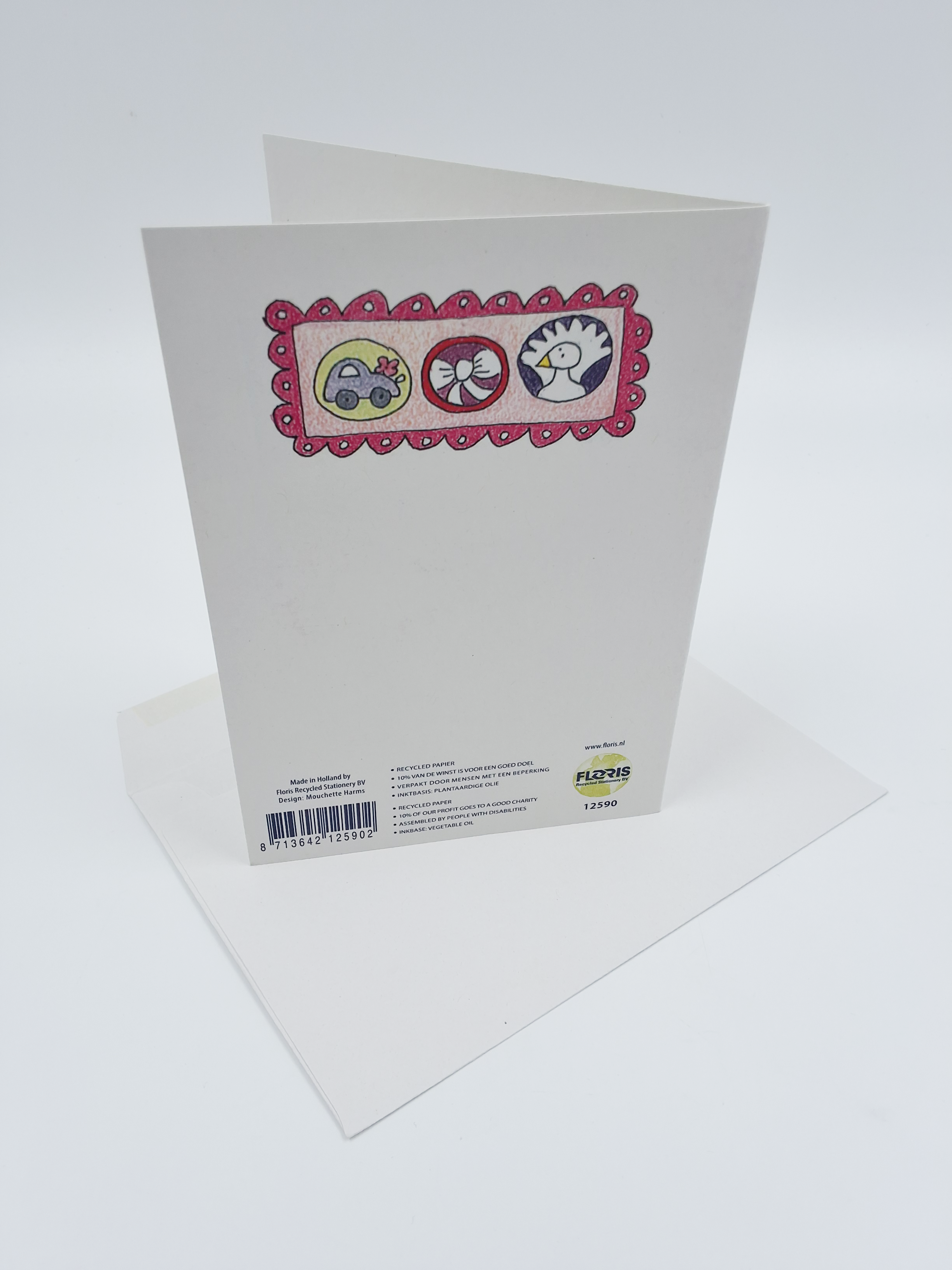 Onze wenskaarten zijn gemaakt van gerecycled papier en bedrukt met inkt op basis van plantaardige olie.