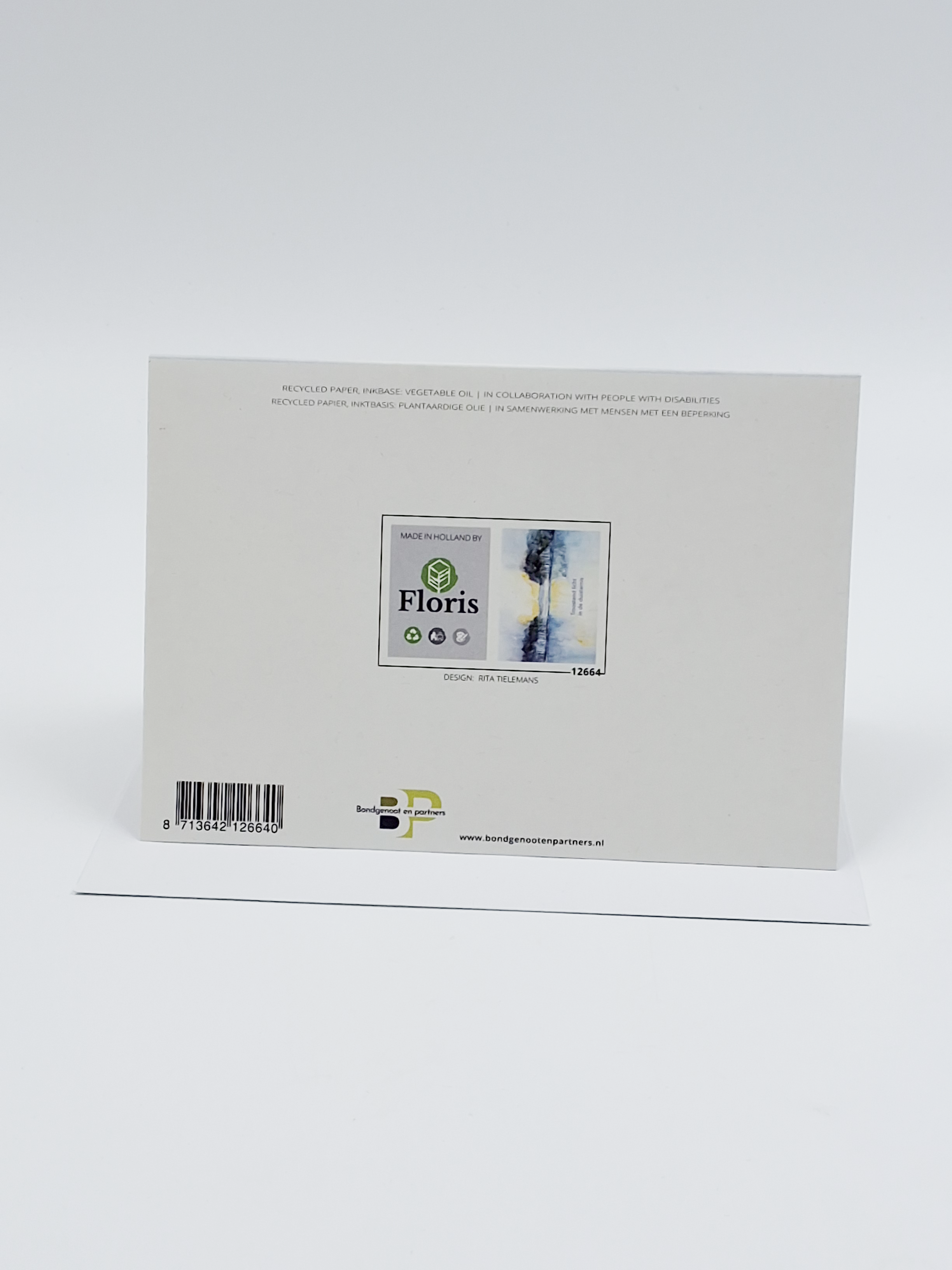 Onze wenskaarten zijn gemaakt van gerecycled papier en bedrukt met inkt op basis van plantaardige olie.