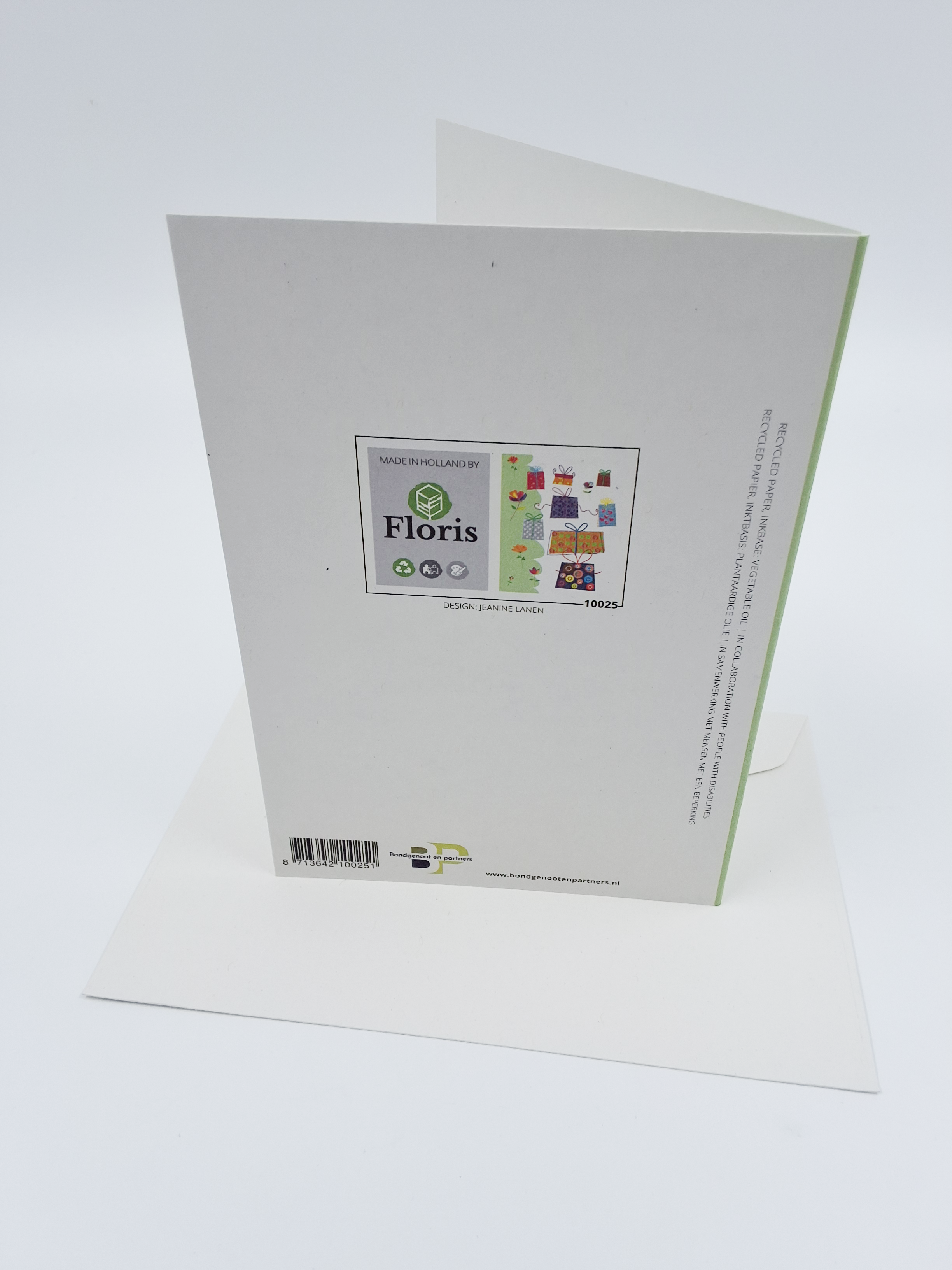 Onze wenskaarten zijn gemaakt van gerecycled papier en bedrukt met inkt op basis van plantaardige olie.