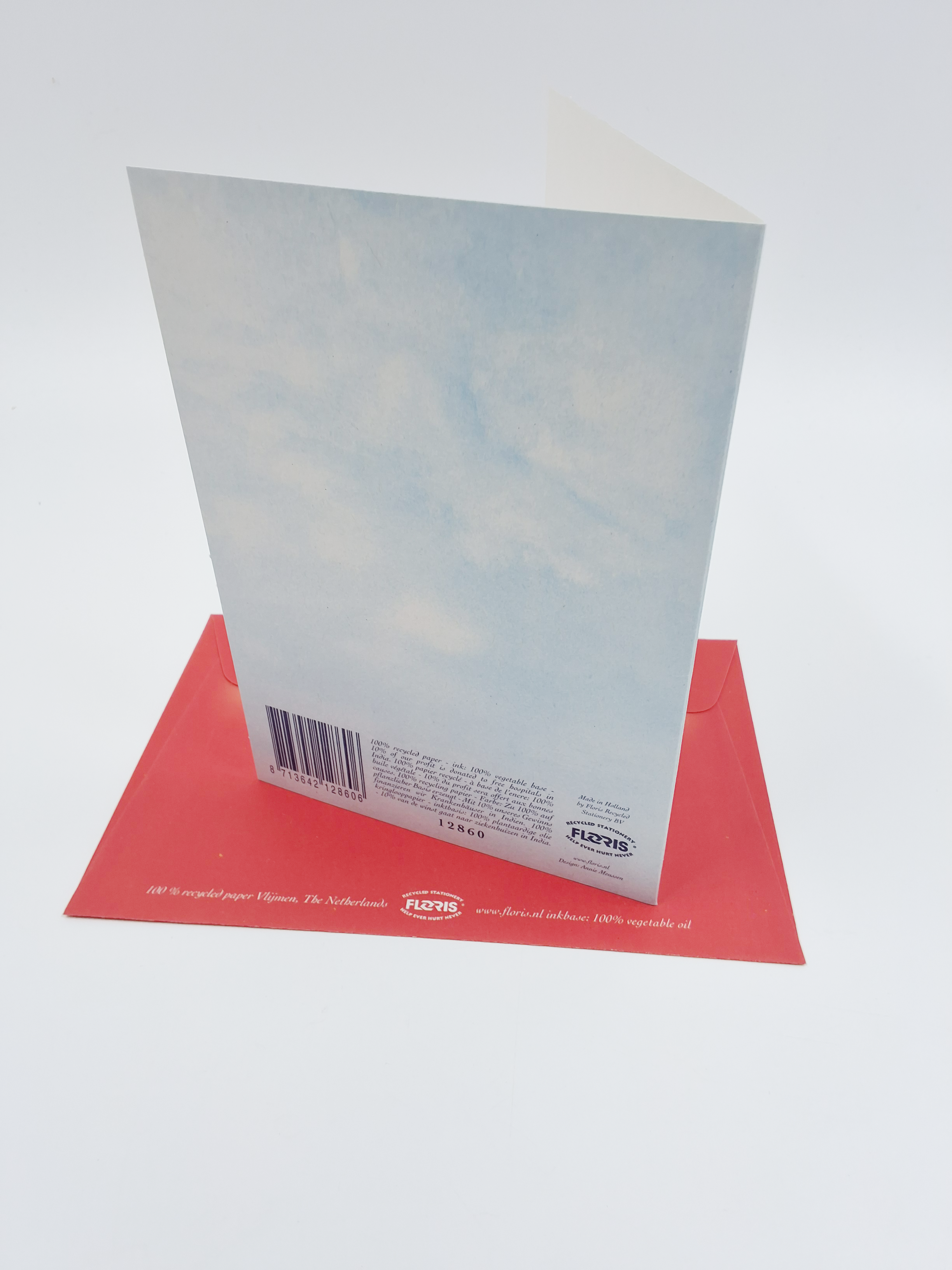 Onze kerstkaarten zijn gemaakt van gerecycled papier en bedrukt met inkt op basis van plantaardige olie.