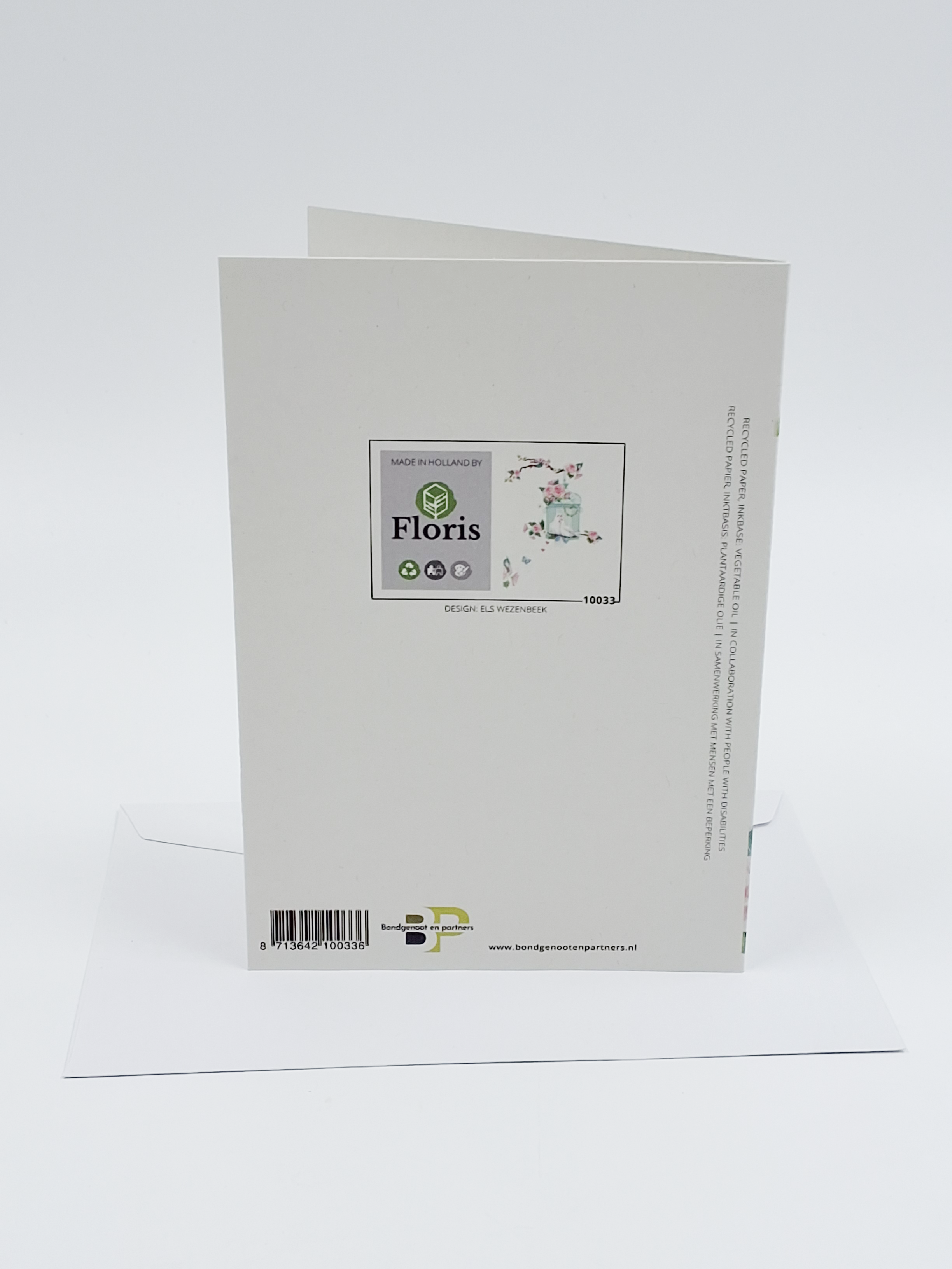 Onze wenskaarten zijn gemaakt van gerecycled papier en bedrukt met inkt op basis van plantaardige olie.