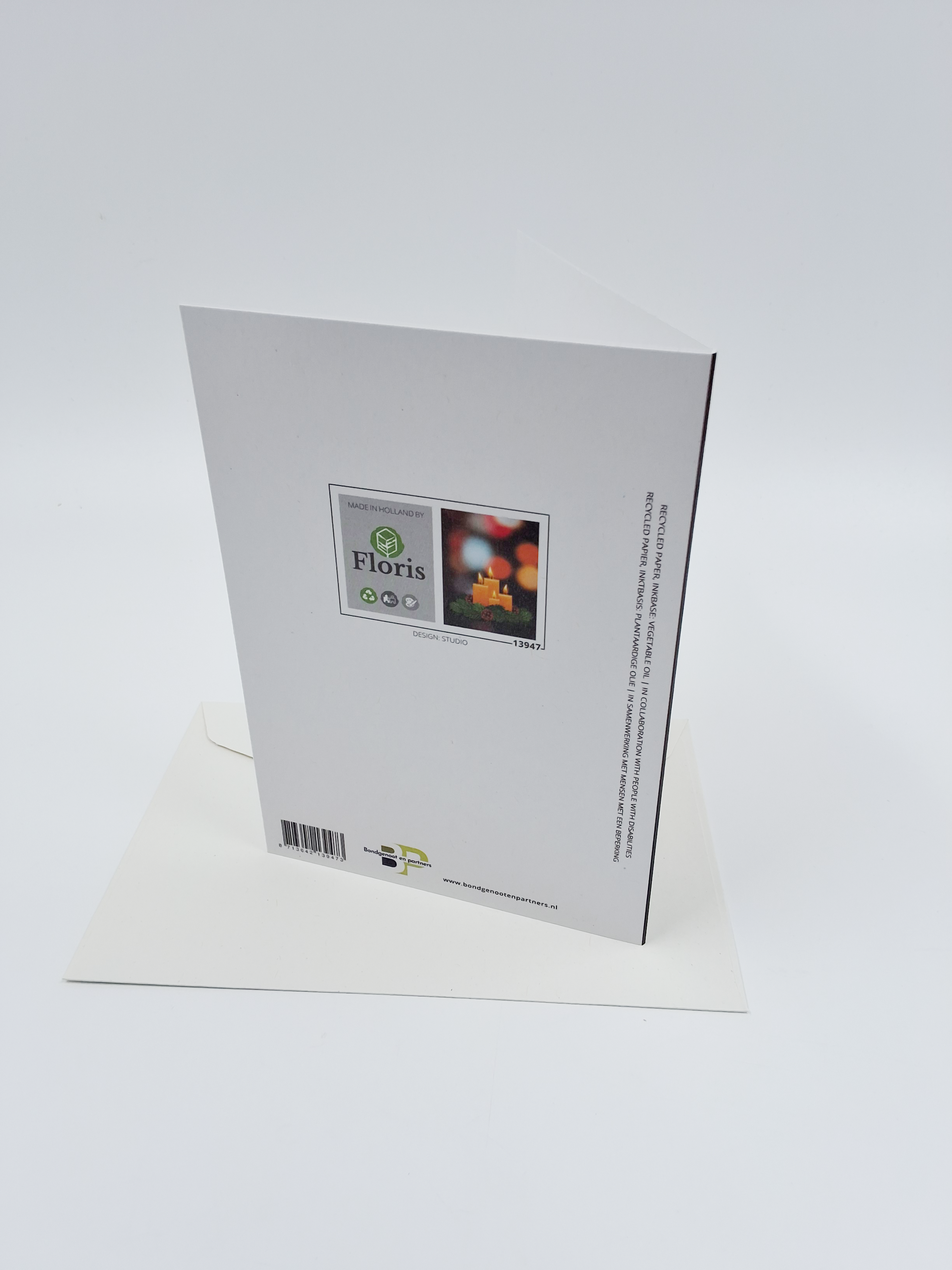 Onze kerstkaarten zijn gemaakt van gerecycled papier en bedrukt met inkt op basis van plantaardige olie.