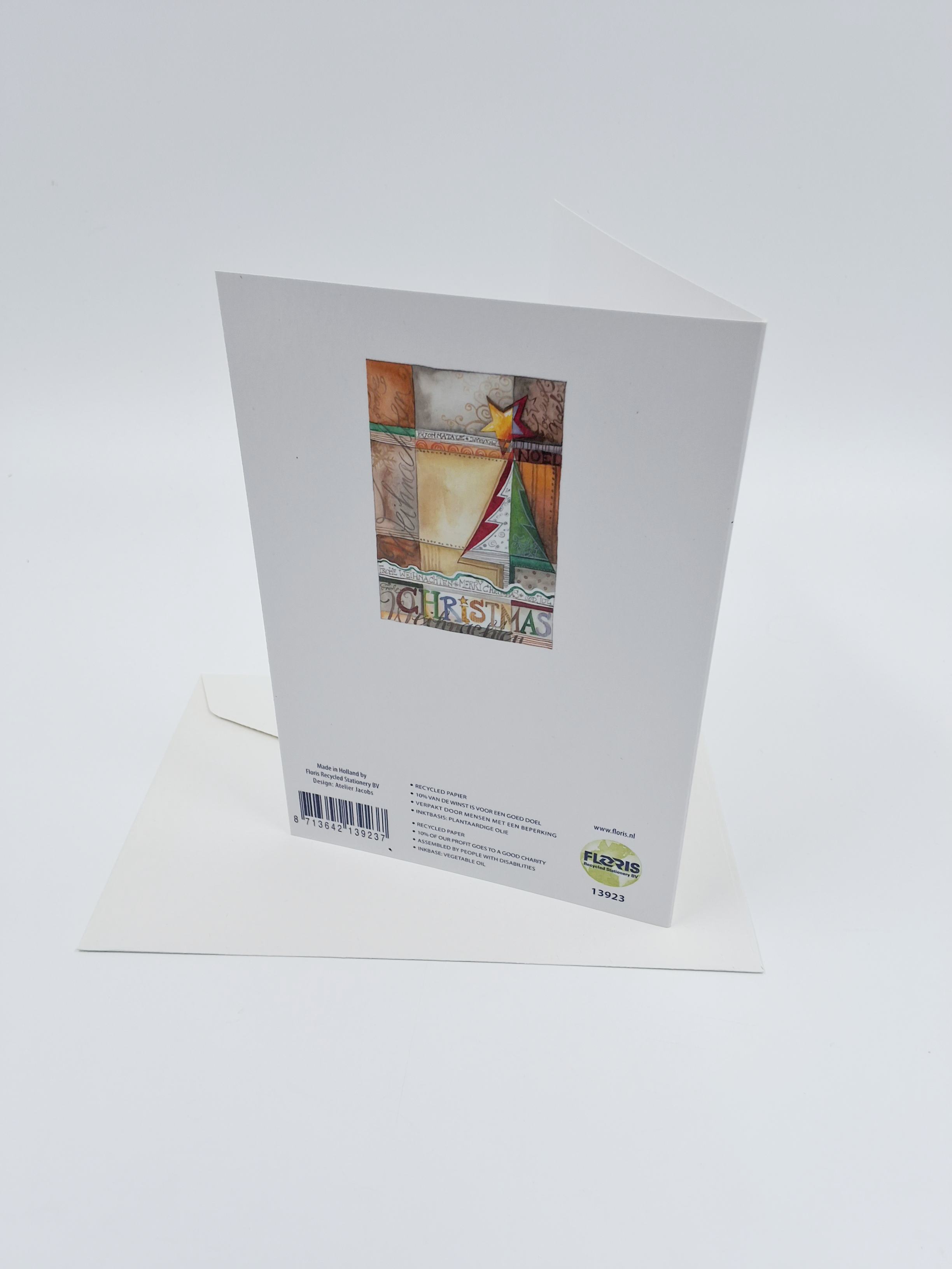 Onze kerstkaarten zijn gemaakt van gerecycled papier en bedrukt met inkt op basis van plantaardige olie.