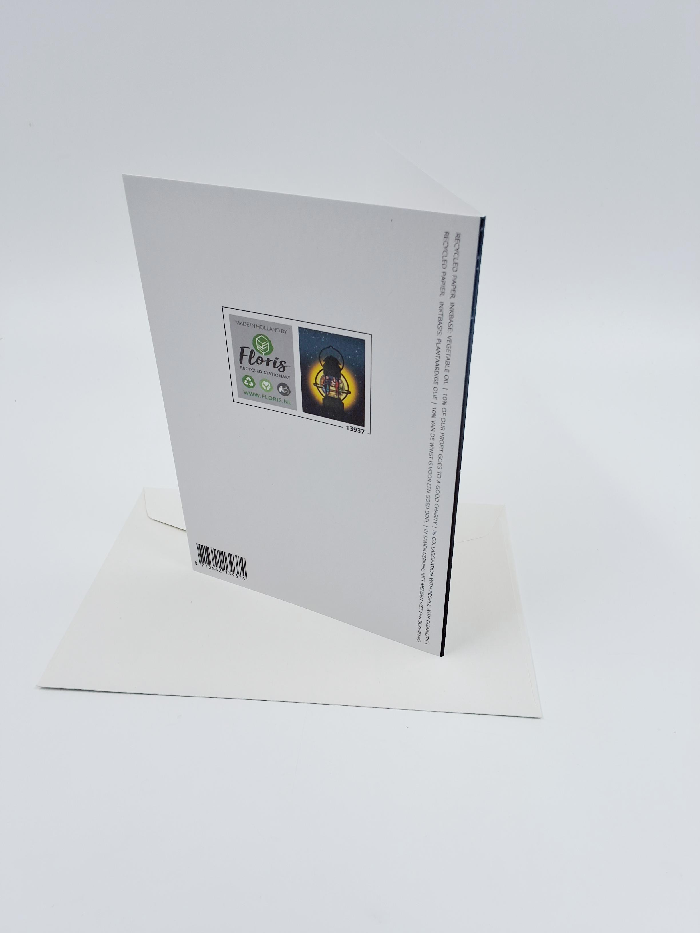 Onze kerstkaarten zijn gemaakt van gerecycled papier en bedrukt met inkt op basis van plantaardige olie.