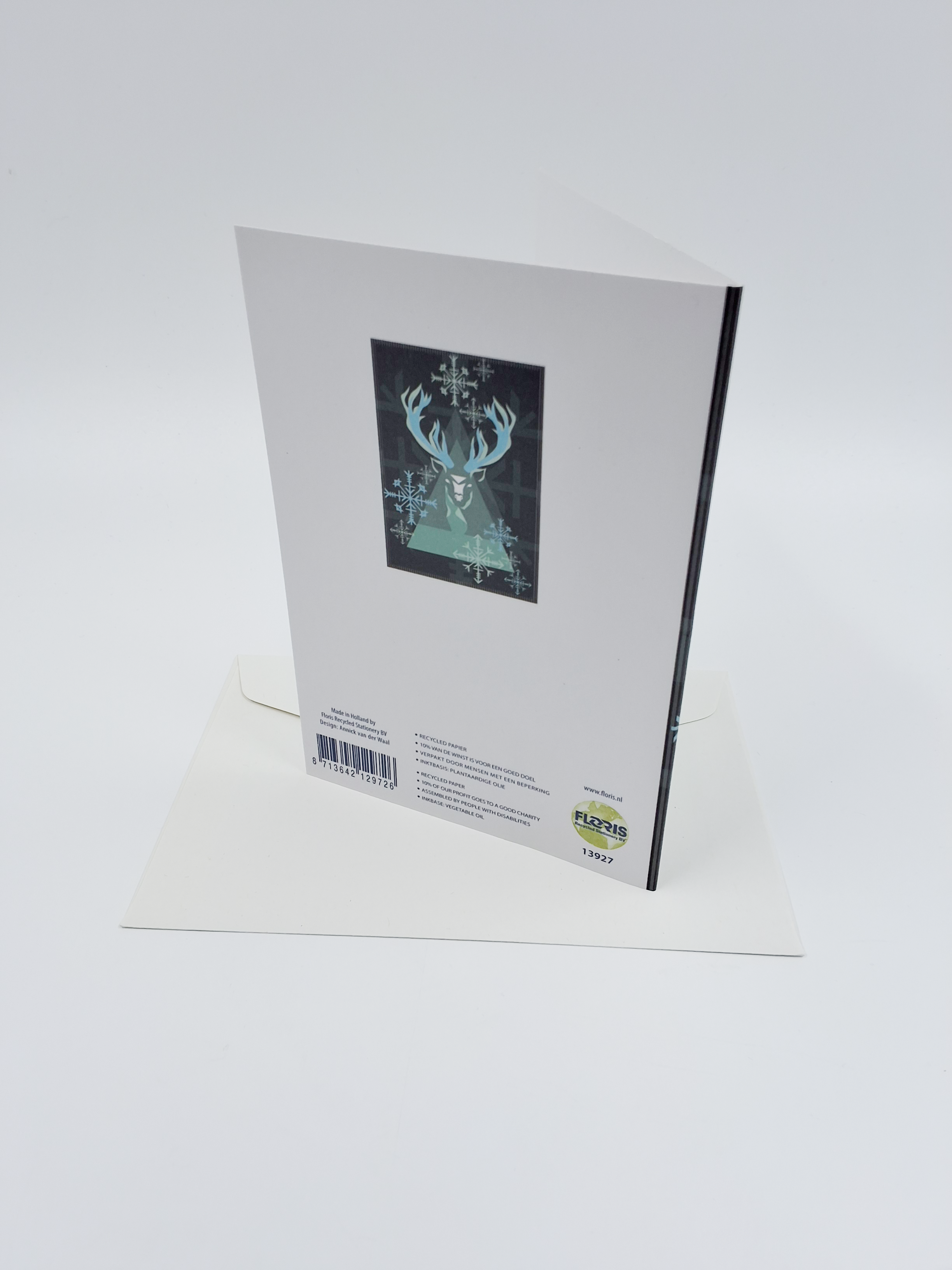 Onze kerstkaarten zijn gemaakt van gerecycled papier en bedrukt met inkt op basis van plantaardige olie.