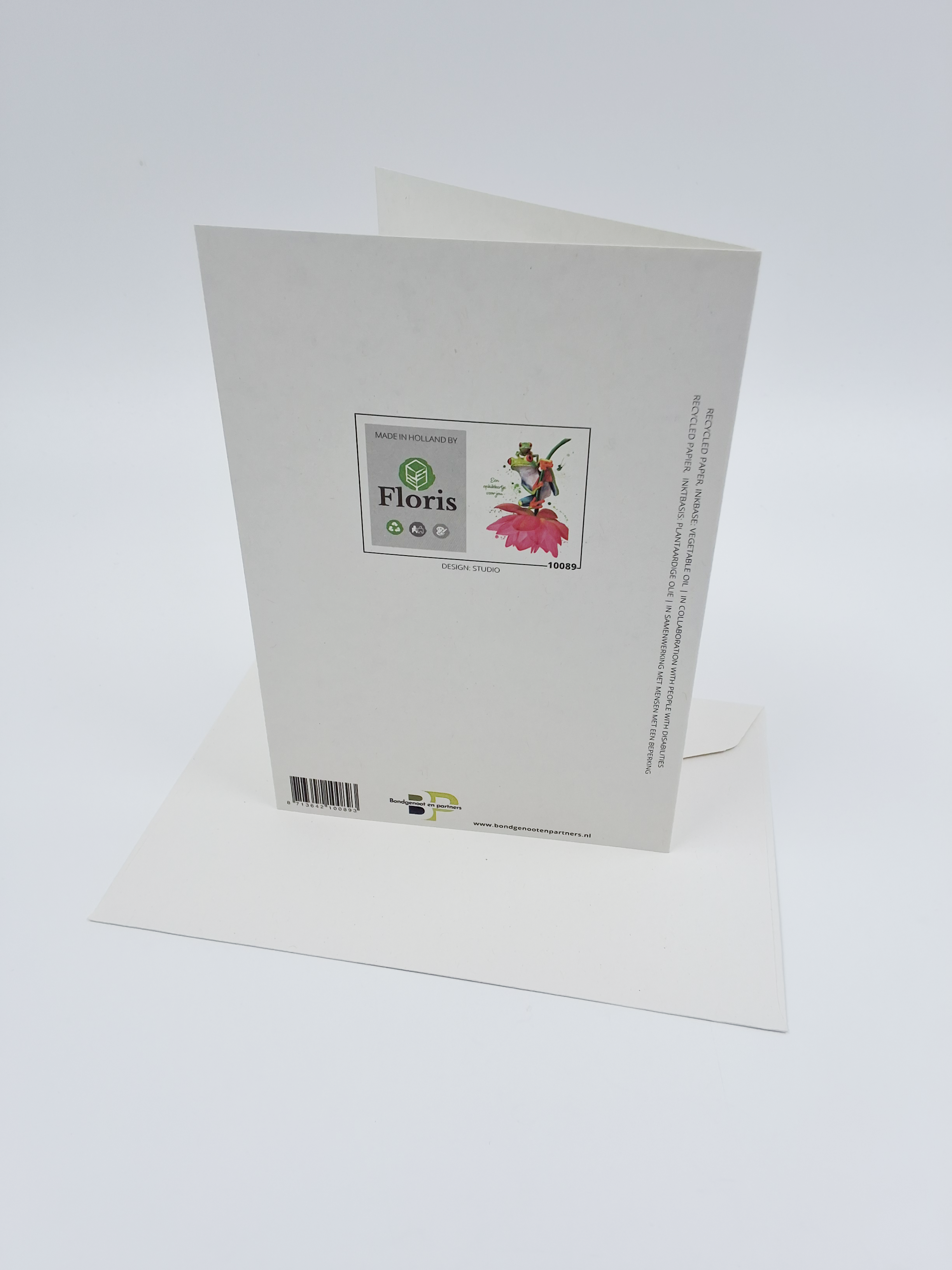 Onze wenskaarten zijn gemaakt van gerecycled papier en bedrukt met inkt op basis van plantaardige olie.