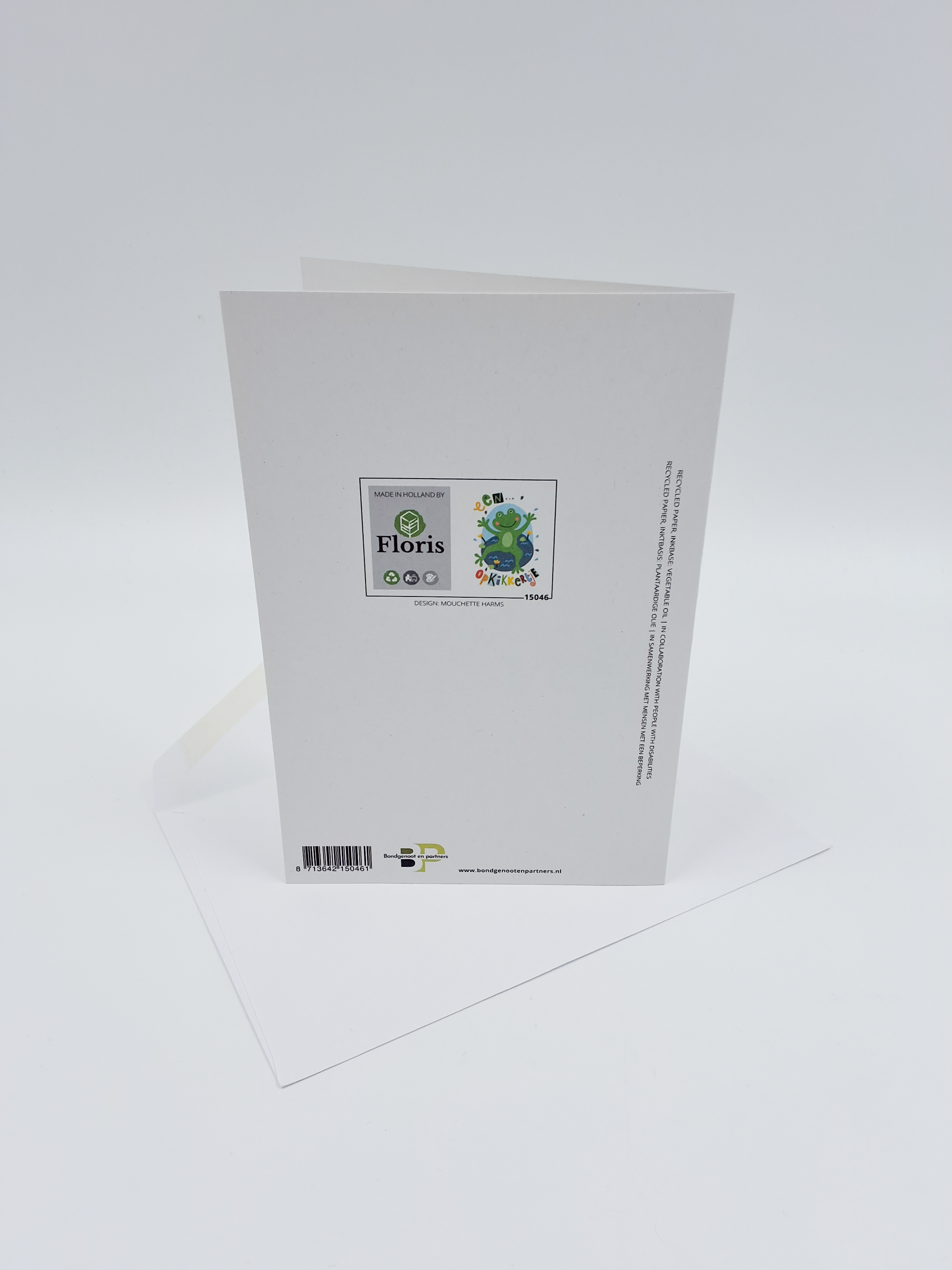 Deze wenskaart is iets groter dan een standaard wenskaart en heeft geen plastiek verpakking. Elke kaart komt met een passende envelop.