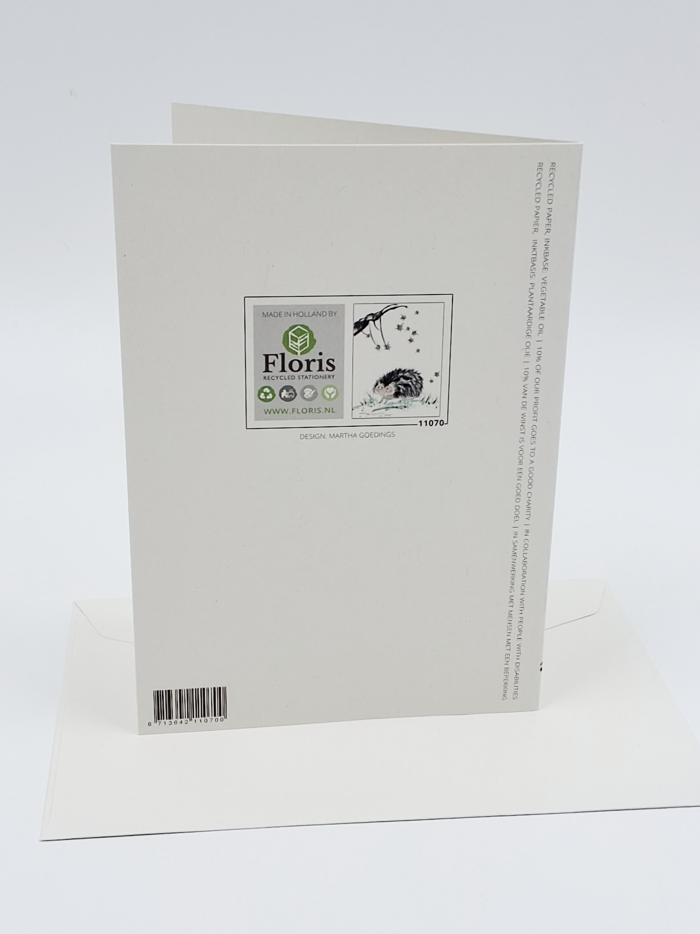 Onze wenskaarten zijn gemaakt van gerecycled papier en bedrukt met inkt op basis van plantaardige olie.