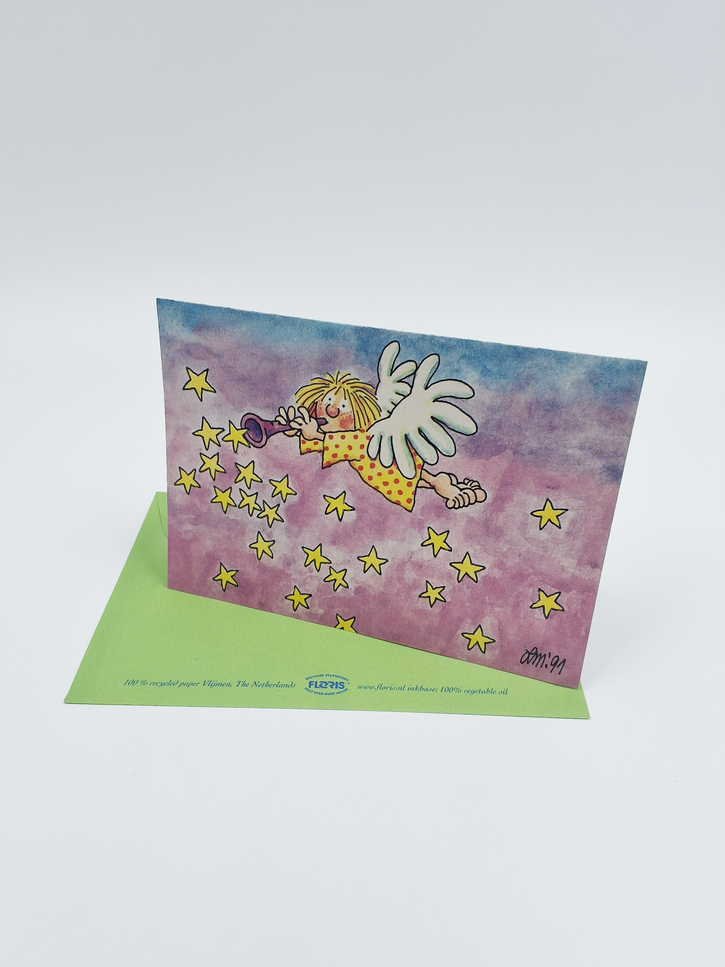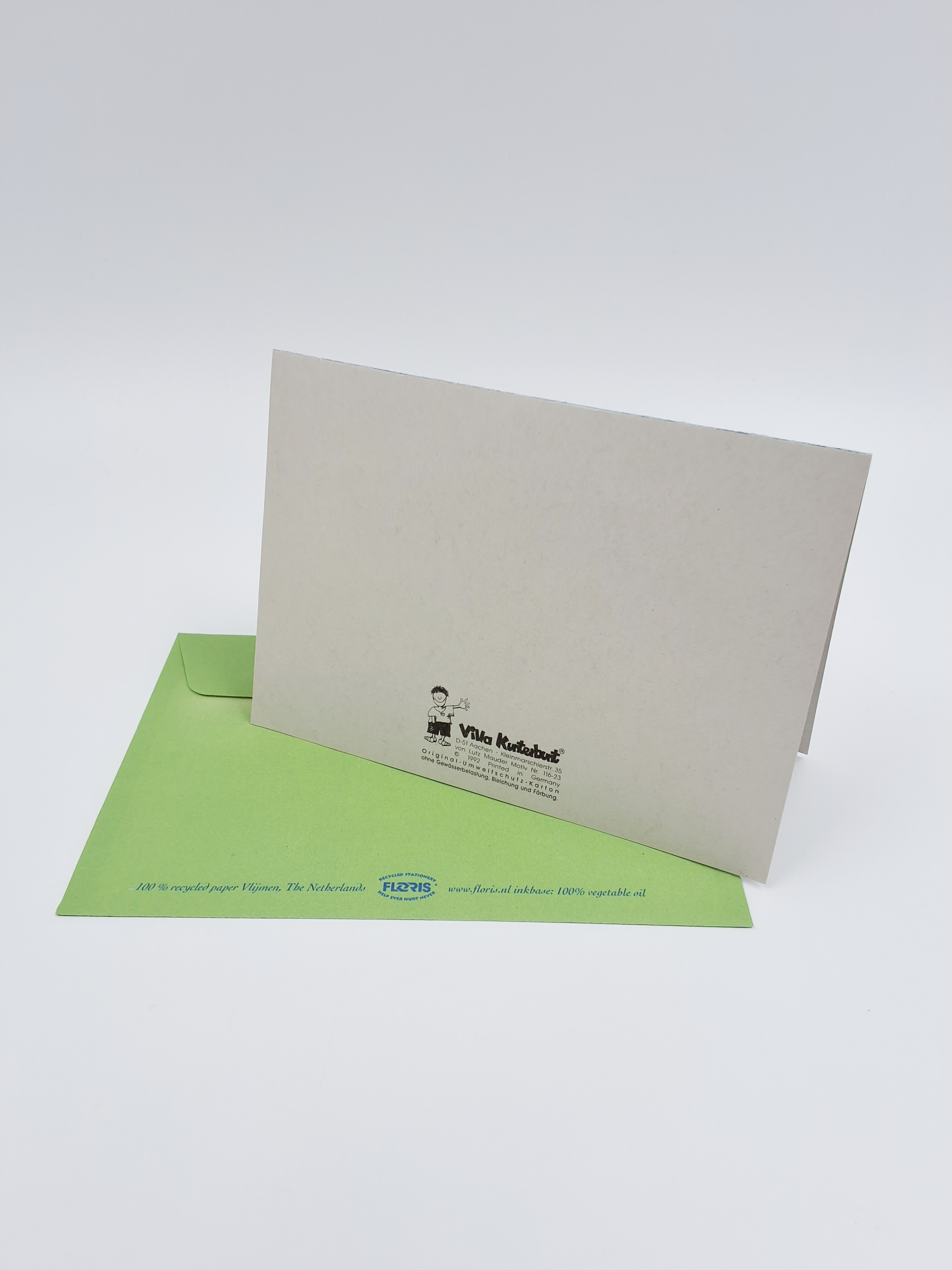 Onze wenskaarten zijn gemaakt van gerecycled papier en bedrukt met inkt op basis van plantaardige olie.